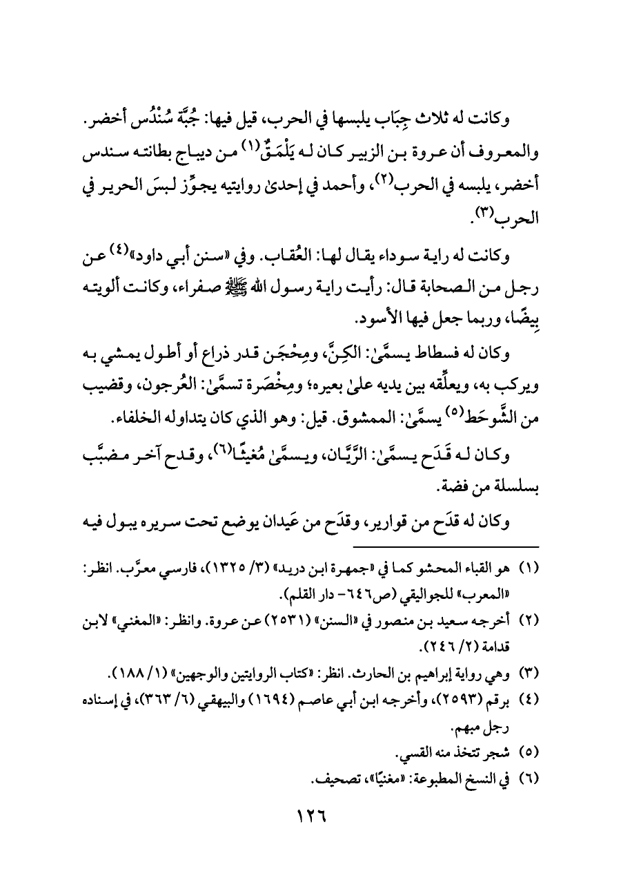 وكانت له ثلاث جِبَاب يلبسها في الحرب، قيل فيها: جُبَّة سُنْدُس أخضر. والمعروف أن عروة بن الزبير كان له يَلْمَقٌ (¬١) من ديباج بطانته سندس أخضر، يلبسه في الحرب (¬٢)، وأحمد في إحدى روايتيه يجوِّز لبسَ الحرير في الحرب (¬٣).