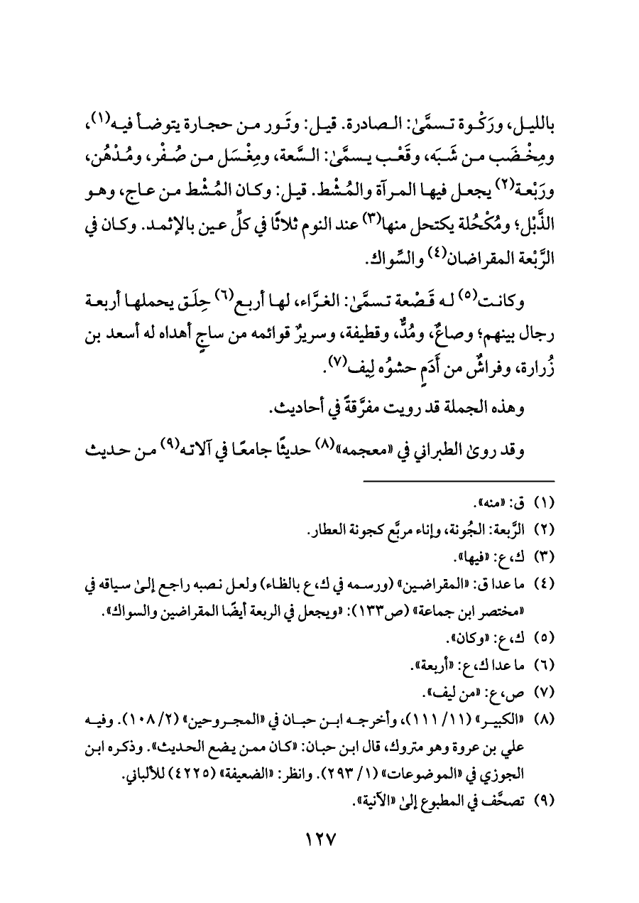 بالليل، ورَكْوة تسمَّى: الصادرة. قيل: وتَور من حجارة يتوضأ فيه (¬١)، ومِخْضَب من شَبَه، وقَعْب يسمَّى: السَّعة، ومِغْسَل من صُفْر، ومُدْهُن، ورَبْعة (¬٢) يجعل فيها المرآة والمُشْط. قيل: وكان المُشْط من عاج، وهو الذَّبْل؛ ومُكْحُلة يكتحل منها (¬٣) عند النوم ثلاثًا في كلِّ عين بالإثمد. وكان في الرَّبْعة المقراضان (¬٤) والسِّواك.