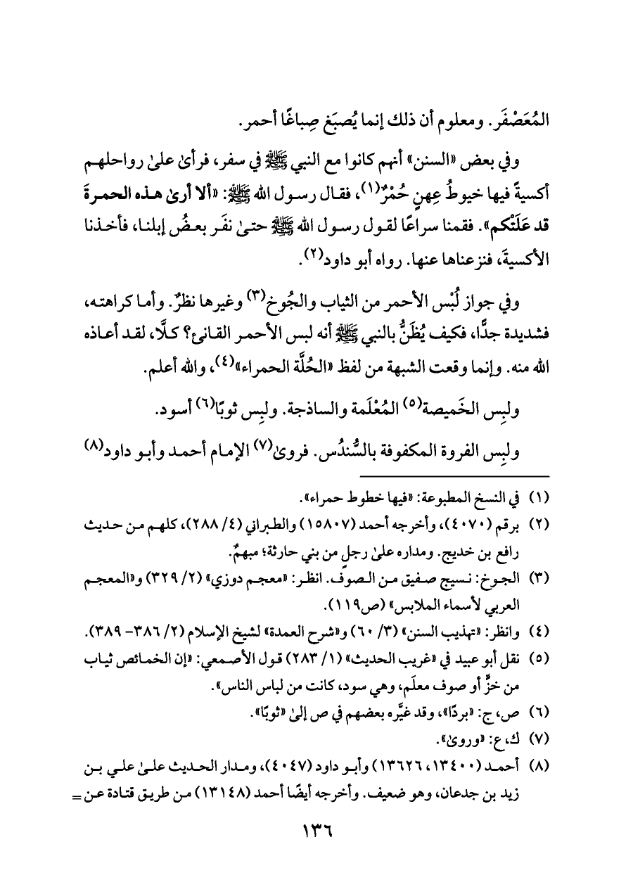 وفي جواز لُبْس الأحمر من الثياب والجُوخ (¬٣) وغيرها نظرٌ. وأما كراهته، فشديدة جدًّا، فكيف يُظَنُّ بالنبي - صلى الله عليه وسلم - أنه لبس الأحمر القانئ؟ كلَّا، لقد أعاذه الله منه. وإنما وقعت الشبهة من لفظ «الحُلَّة الحمراء» (¬٤)، والله أعلم.