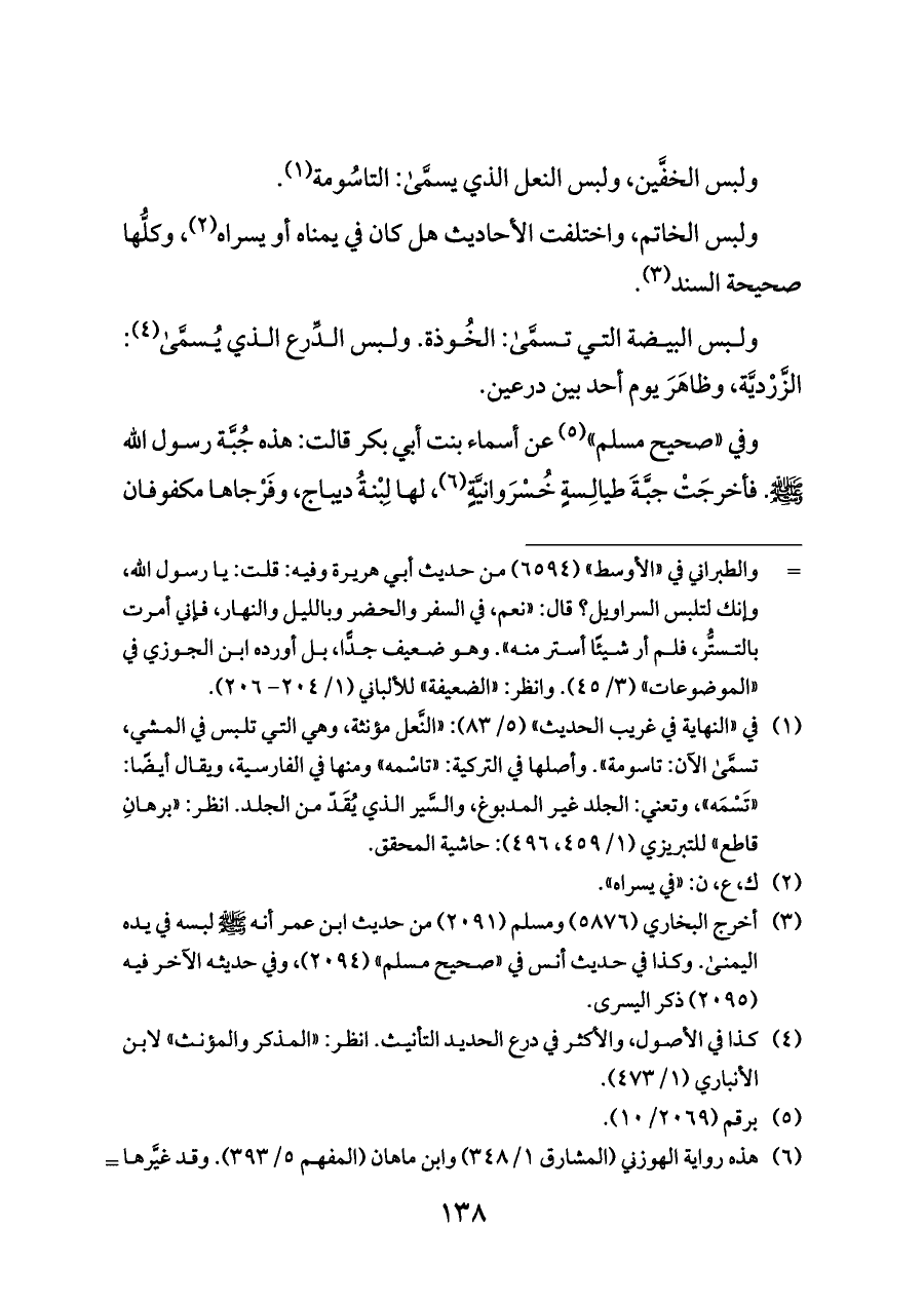 (¬١) في «النهاية في غريب الحديث» (٥/ ٨٣): «النَّعل مؤنثة، وهي التي تلبس في المشي، تسمَّى الآن: تاسومة». وأصلها في التركية: «تاسْمه» ومنها في الفارسية، ويقال أيضًا: «تَسْمَه»، وتعني: الجلد غير المدبوغ، والسَّير الذي يُقَدّ من الجلد. انظر: «برهانِ قاطع» للتبريزي (١/ ٤٥٩، ٤٩٦): حاشية المحقق.