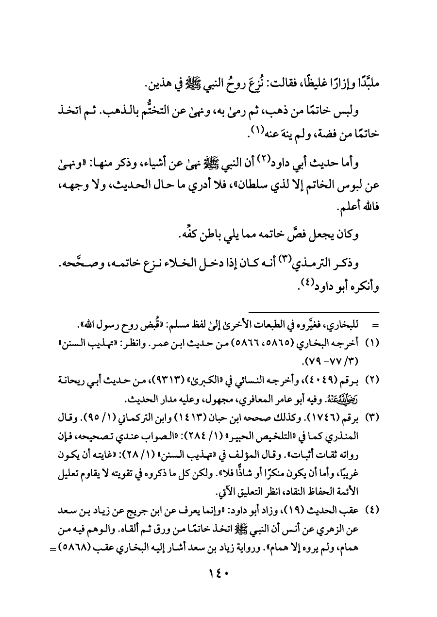 (¬٤) عقب الحديث (١٩)، وزاد أبو داود: «وإنما يعرف عن ابن جريج عن زياد بن سعد عن الزهري عن أنس أن النبي - صلى الله عليه وسلم - اتخذ خاتمًا من ورق ثم ألقاه. والوهم فيه من همام، ولم يروه إلا همام». ورواية زياد بن سعد أشار إليه البخاري عقب (٥٨٦٨) ورواه مسلم (٢٠٩٣/ ٦٠). وتابع أبا داود البيهقيُّ (١/ ٩٤، ٩٥) ثم ذكر له شاهدًا وضعفه أيضًا. وبمثل كلام أبي داود قال الدارقطني في «علله» (٢٥٨٧) وأطال النفس جدًّا. وقال النسائي في «الكبرى» عقب (٩٤٧٠): «وهذا الحديث غير محفوظ، والله أعلم».