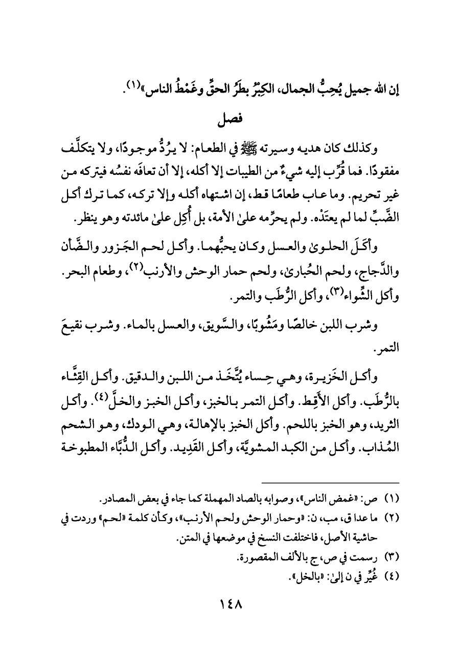 وكذلك كان هديه وسيرته - صلى الله عليه وسلم - في الطعام: لا يرُدُّ موجودًا، ولا يتكلَّف مفقودًا. فما قُرِّب إليه شيءٌ من الطيبات إلا أكله، إلا أن تعافَه نفسُه فيتركه من غير تحريم. وما عاب طعامًا قط، إن اشتهاه أكله وإلا تركه، كما ترك أكل الضَّبِّ لما لم يعتَدْه. ولم يحرِّمه على الأمة، بل أُكِل على مائدته وهو ينظر.