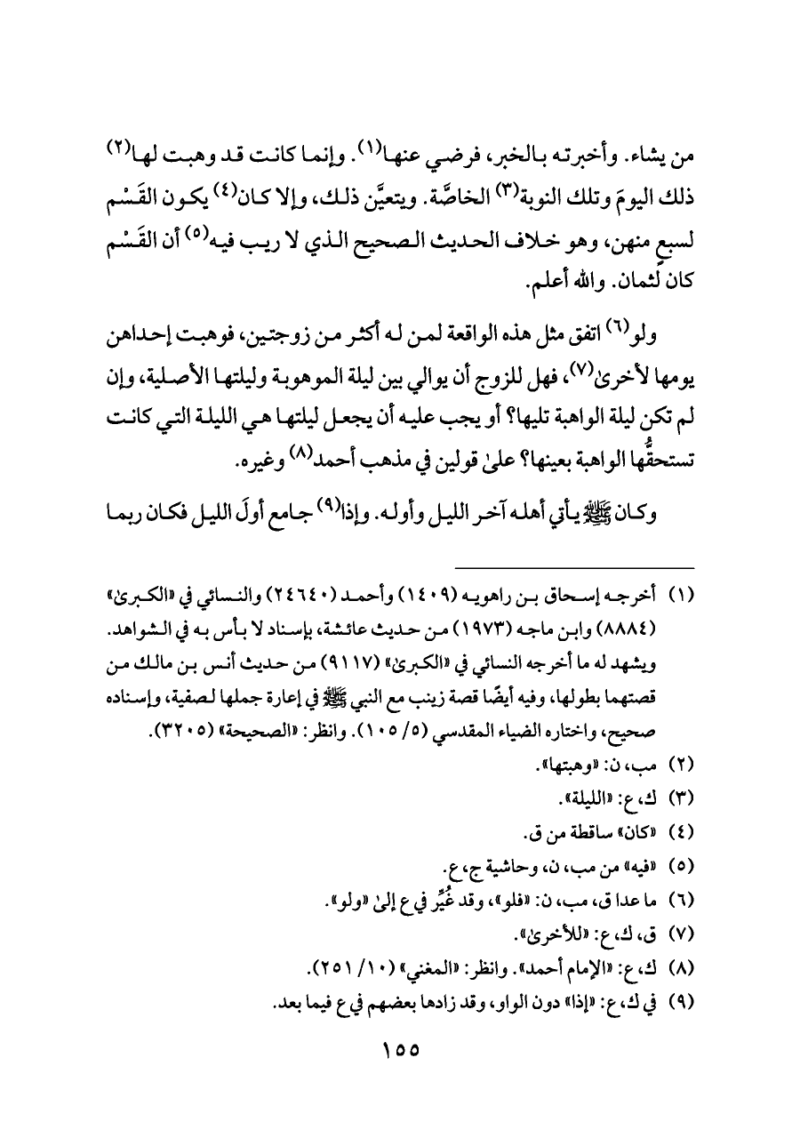 من يشاء. وأخبرته بالخبر، فرضي عنها (¬١). وإنما كانت قد وهبت لها (¬٢) ذلك اليومَ وتلك النوبة (¬٣) الخاصَّة. ويتعيَّن ذلك، وإلا كان (¬٤) يكون القَسْم لسبعٍ منهن، وهو خلاف الحديث الصحيح الذي لا ريب فيه (¬٥) أن القَسْم كان لثمان. والله أعلم.