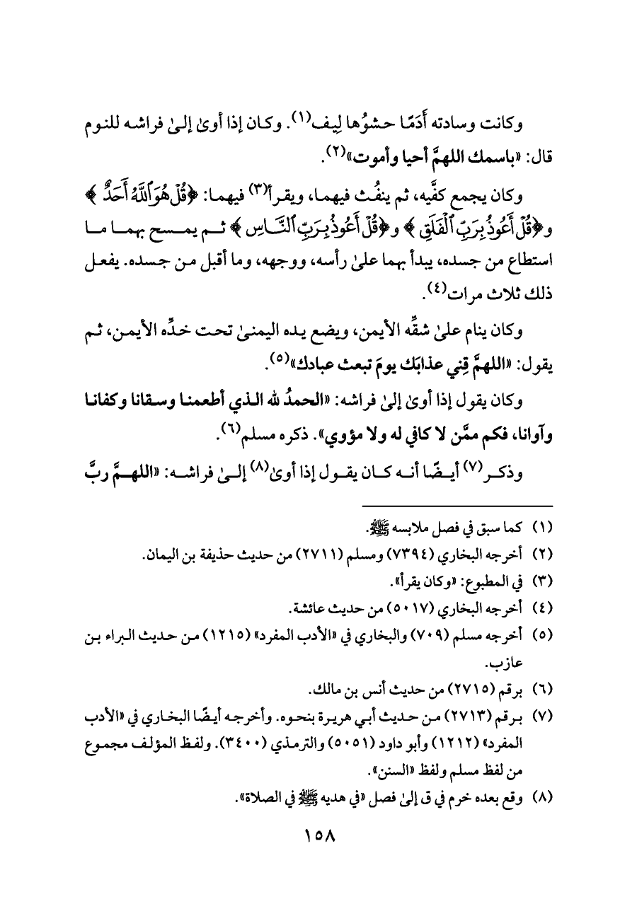 وكان ينام على شقِّه الأيمن، ويضع يده اليمنى تحت خدِّه الأيمن، ثم يقول: «اللهمَّ قِني عذابَك يومَ تبعث عبادك» (¬٥).