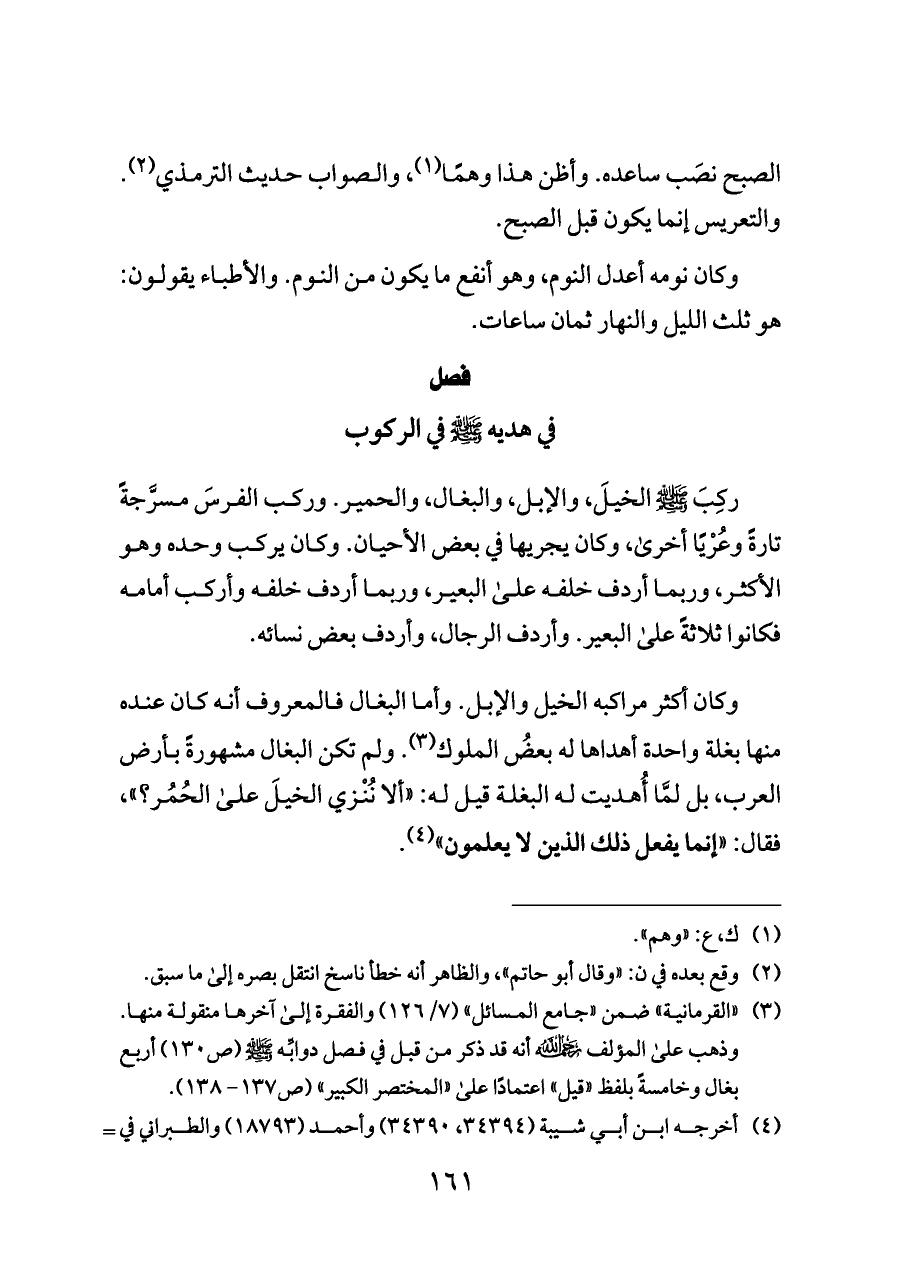 (¬٣) «القرمانية» ضمن «جامع المسائل» (٧/ ١٢٦) والفقرة إلى آخرها منقولة منها. وذهب على المؤلف - رحمه الله - أنه قد ذكر من قبل في فصل دوابِّه - صلى الله عليه وسلم - (ص ١٣٠) أربع بغال وخامسةً بلفظ «قيل» اعتمادًا على «المختصر الكبير» (ص ١٣٧ - ١٣٨).
