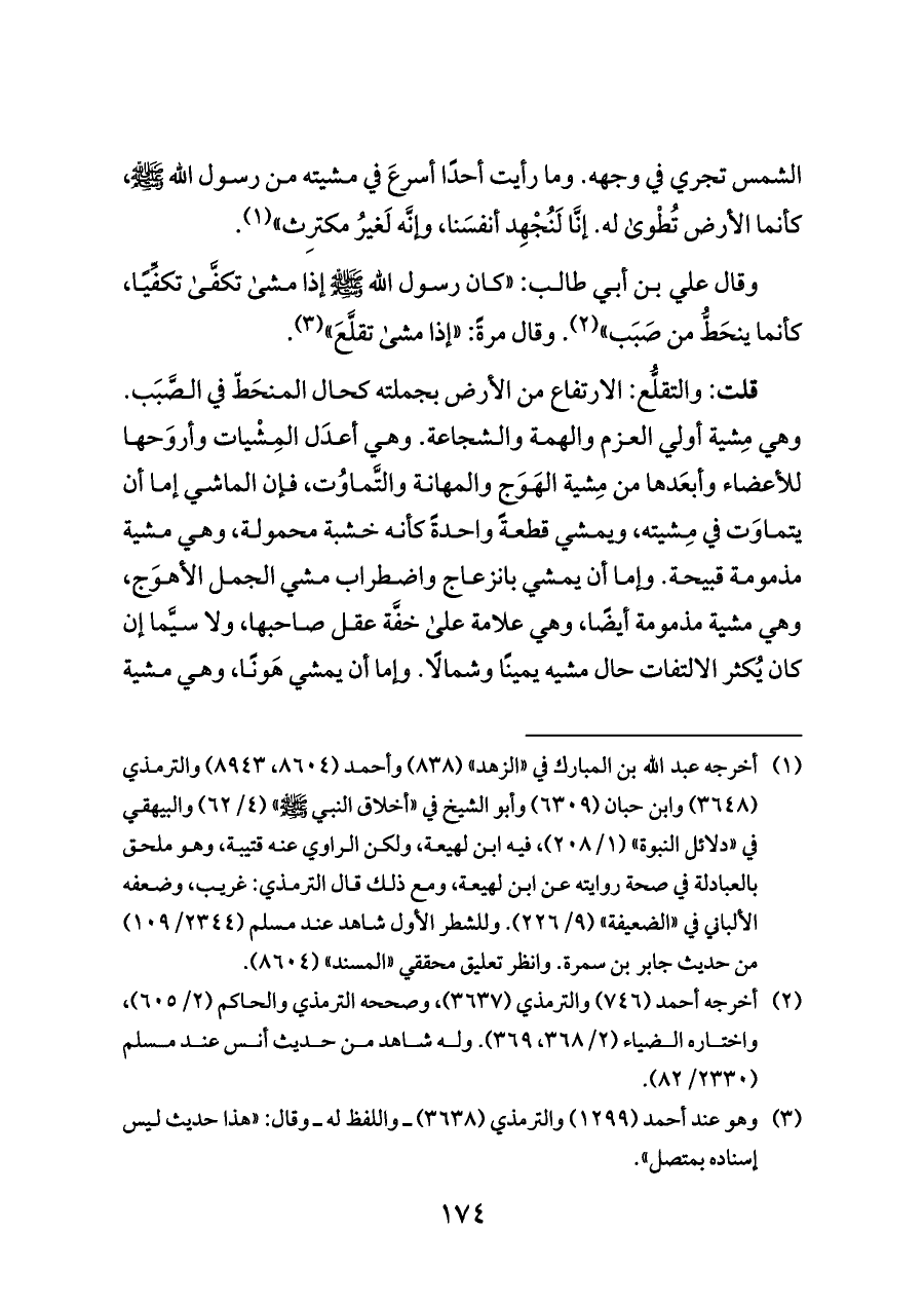 وقال علي بن أبي طالب: «كان رسول الله - صلى الله عليه وسلم - إذا مشى تكفَّى تكفِّيًا، كأنما ينحَطُّ من صَبَب» (¬٢). وقال مرةً: «إذا مشى تقلَّعَ» (¬٣).