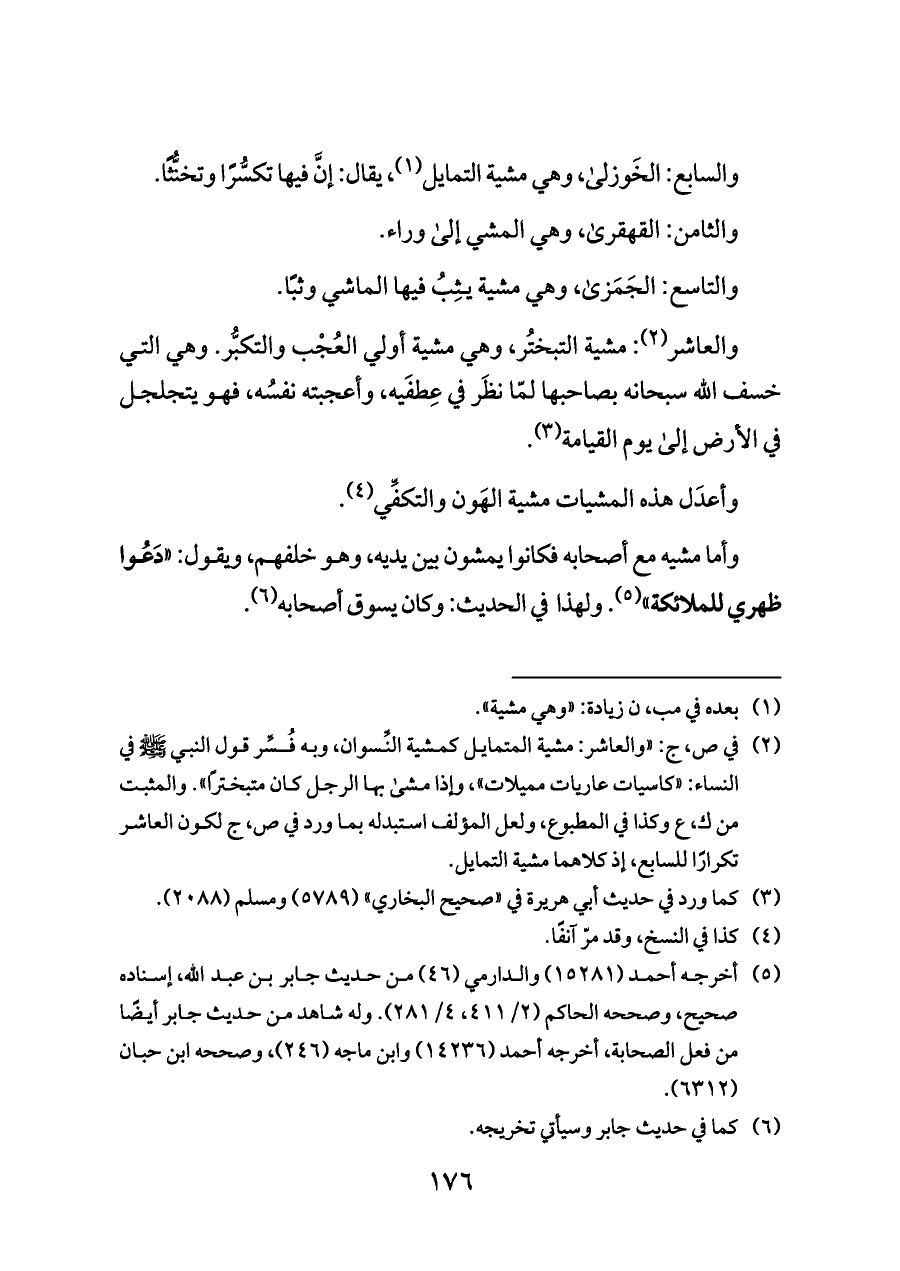 (¬٢) في ص، ج: «والعاشر: مشية المتمايل كمشية النِّسوان، وبه فُسِّر قول النبي - صلى الله عليه وسلم - في النساء: «كاسيات عاريات مميلات»، وإذا مشى بها الرجل كان متبخترًا». والمثبت من ك، ع وكذا في المطبوع، ولعل المؤلف استبدله بما ورد في ص، ج لكون العاشر تكرارًا للسابع، إذ كلاهما مشية التمايل.