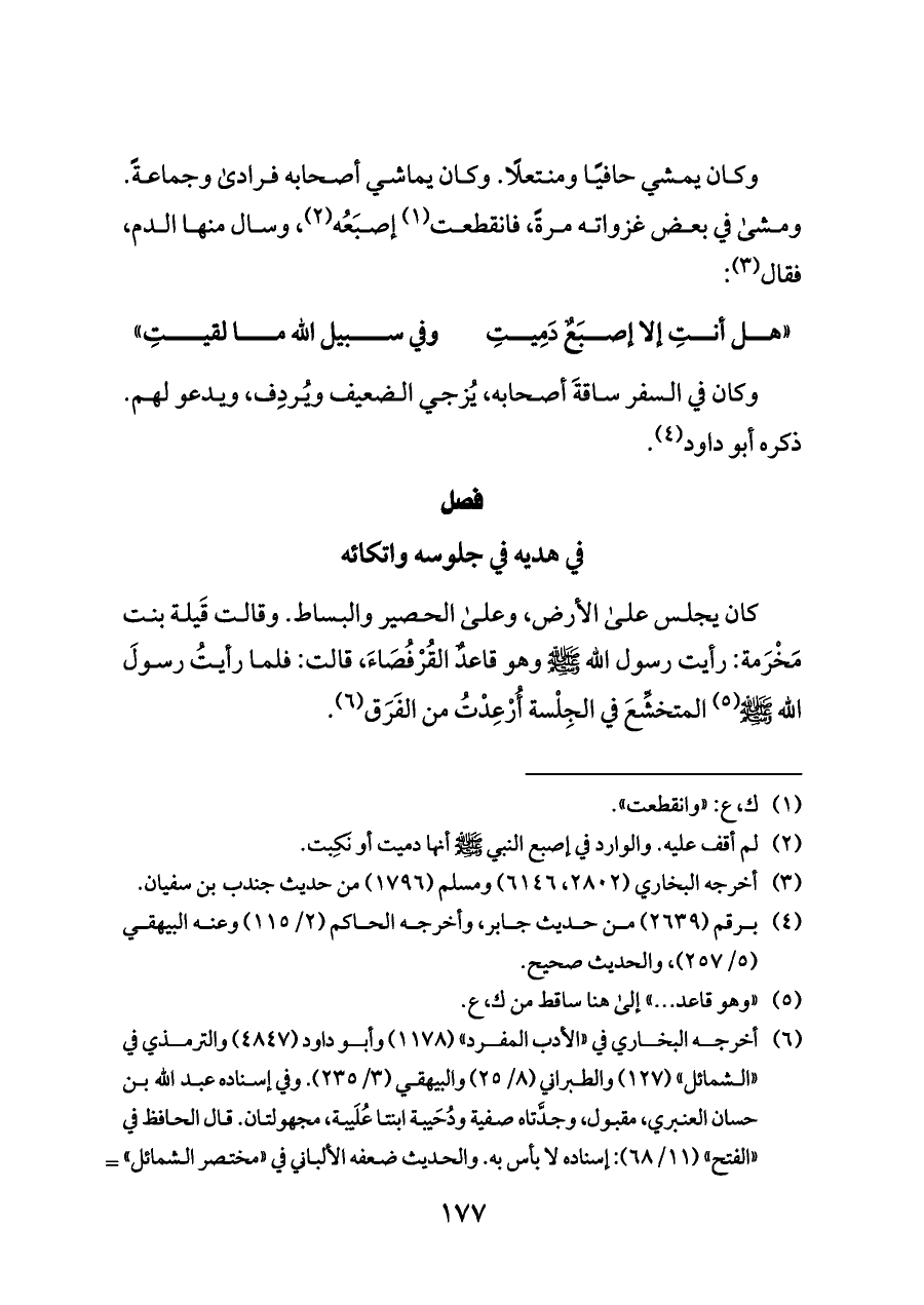 وكان يمشي حافيًا ومنتعلًا. وكان يماشي أصحابه فرادى وجماعةً. ومشى في بعض غزواته مرةً، فانقطعت (¬١) إصبَعُه (¬٢)، وسال منها الدم، فقال (¬٣):