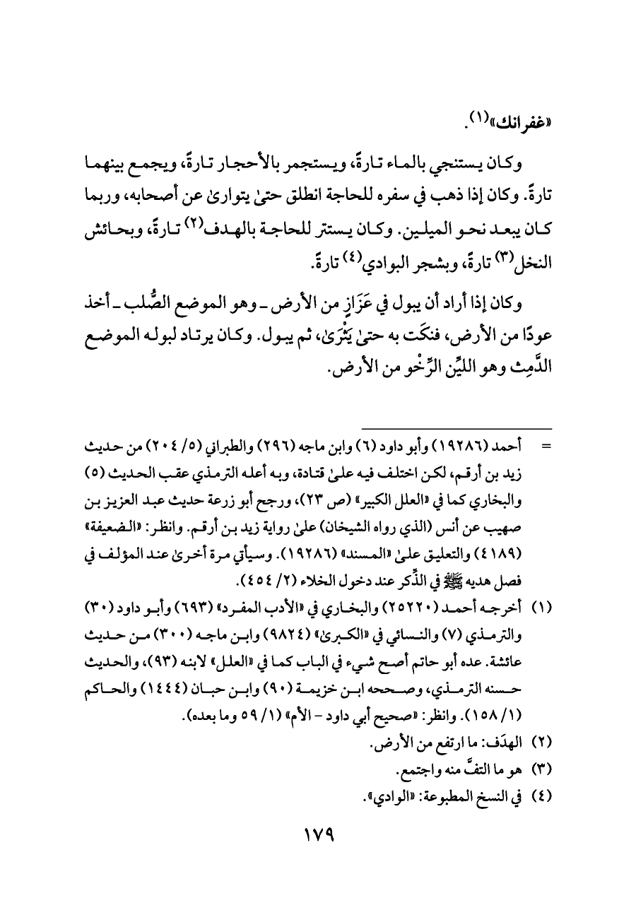 وكان يستنجي بالماء تارةً، ويستجمر بالأحجار تارةً، ويجمع بينهما تارةً. وكان إذا ذهب في سفره للحاجة انطلق حتى يتوارى عن أصحابه، وربما كان يبعد نحو الميلين. وكان يستتر للحاجة بالهدف (¬٢) تارةً، وبحائش النخل (¬٣) تارةً، وبشجر البوادي (¬٤) تارةً.