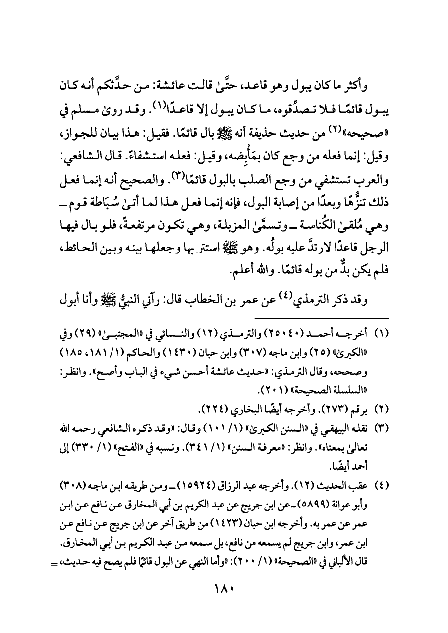 وقد ذكر الترمذي (¬٤) عن عمر بن الخطاب قال: رآني النبيُّ - صلى الله عليه وسلم - وأنا أبول