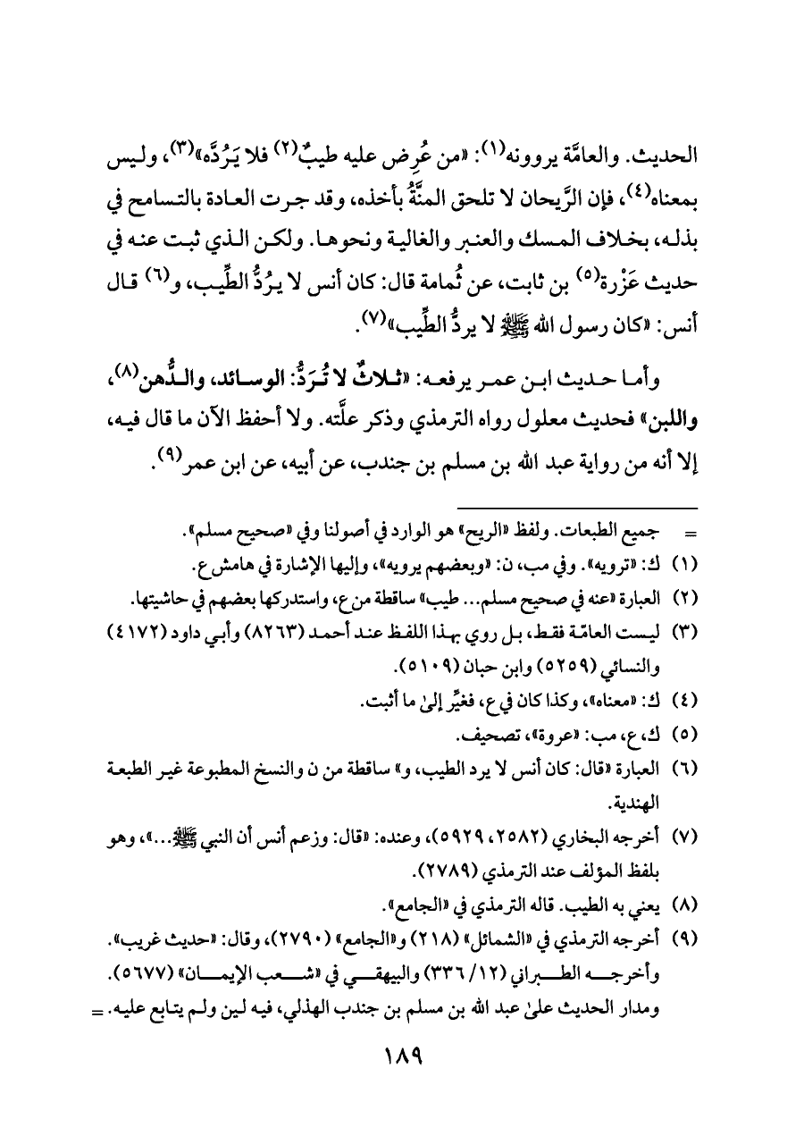 الحديث. والعامَّة يروونه (¬١): «من عُرِض عليه طيبٌ (¬٢) فلا يَرُدَّه» (¬٣)، وليس بمعناه (¬٤)، فإن الرَّيحان لا تلحق المنَّةُ بأخذه، وقد جرت العادة بالتسامح في بذله، بخلاف المسك والعنبر والغالية ونحوها. ولكن الذي ثبت عنه في حديث عَزْرة (¬٥) بن ثابت، عن ثُمامة قال: كان أنس لا يرُدُّ الطِّيب، و (¬٦) قال أنس: «كان رسول الله - صلى الله عليه وسلم - لا يردُّ الطِّيب» (¬٧).