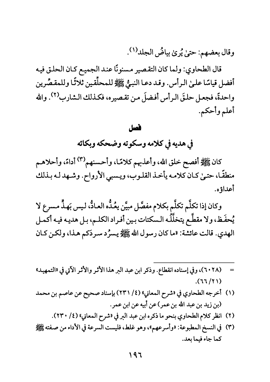 وكان إذا تكلَّم تكلَّم بكلام مفصَّل مبيَّن يعُدُّه العادُّ، ليس بَهذٍّ مسرع لا يُحفَظ، ولا مقطَّع يتخلَّلُه السكتات بين أفراد الكلم، بل هديه فيه أكمل الهدي. قالت عائشة: «ما كان رسول الله - صلى الله عليه وسلم - يسرُد سردَكم هذا، ولكن كان