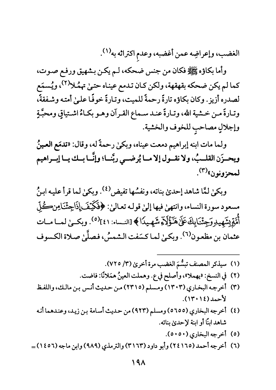 وبكى لمَّا شاهد إحدى بناته، ونفسُها تفيض (¬٤). وبكى لما قرأ عليه ابنُ مسعود سورة النساء، وانتهى فيها إلى قوله تعالى: {فَكَيْفَ إِذَا جِئْنَا مِنْ كُلِّ أُمَّةٍ بِشَهِيدٍ وَجِئْنَا بِكَ عَلَى هَؤُلَاءِ شَهِيدًا} [النساء: ٤١] (¬٥). وبكى لما مات عثمان بن مظعون (¬٦). وبكى لما كسَفت الشمسُ، فصلَّى صلاة الكسوف