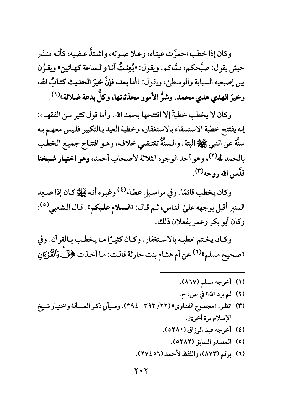 وكان إذا خطب احمرَّت عيناه، وعلا صوته، واشتدَّ غضبه، كأنه منذر جيش يقول: صبَّحكم، مسَّاكم. ويقول: «بُعِثتُ أنا والساعة كهاتين» ويقرُن بين إصبعيه السبابة والوسطى، ويقول: «أما بعد، فإنَّ خيرَ الحديث كتابُ الله، وخيرَ الهدي هدي محمد. وشرُّ الأمور محدَثاتها، وكلُّ بدعة ضلالة» (¬١).