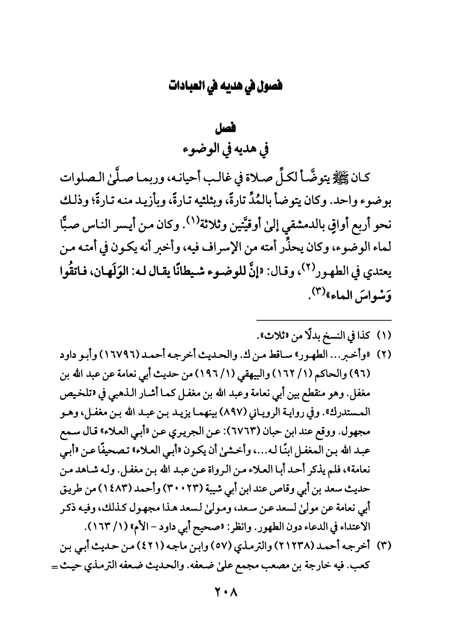 كان - صلى الله عليه وسلم - يتوضَّأ لكلِّ صلاة في غالب أحيانه، وربما صلَّى الصلوات بوضوء واحد. وكان يتوضأ بالمُدِّ تارةً، وبثلثيه تارةً، وبأزيد منه تارةً؛ وذلك نحو أربع أواقٍ بالدمشقي إلى أوقيَّتين وثلاثة (¬١). وكان من أيسر الناس صبًّا لماء الوضوء، وكان يحذِّر أمته من الإسراف فيه، وأخبر أنه يكون في أمته من يعتدي في الطهور (¬٢)، وقال: «إنَّ للوضوء شيطانًا يقال له: الوَلَهان، فاتقُوا وَسْواسَ الماء» (¬٣).