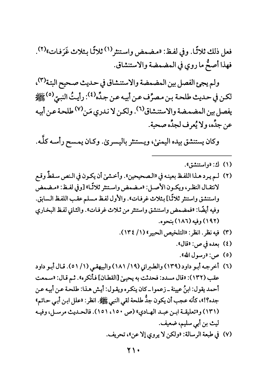 ولم يجئ الفصل بين المضمضة والاستنشاق في حديث صحيح البتة (¬٣)، لكن في حديث طلحة بن مصرِّف عن أبيه عن جدِّه (¬٤): رأيتُ النبيّ (¬٥) - صلى الله عليه وسلم - يفصل بين المضمضة والاستنشاق (¬٦). ولكن لا ندري مَن (¬٧) طلحة عن أبيه عن جدِّه، ولا يُعرف لجدِّه صحبة.