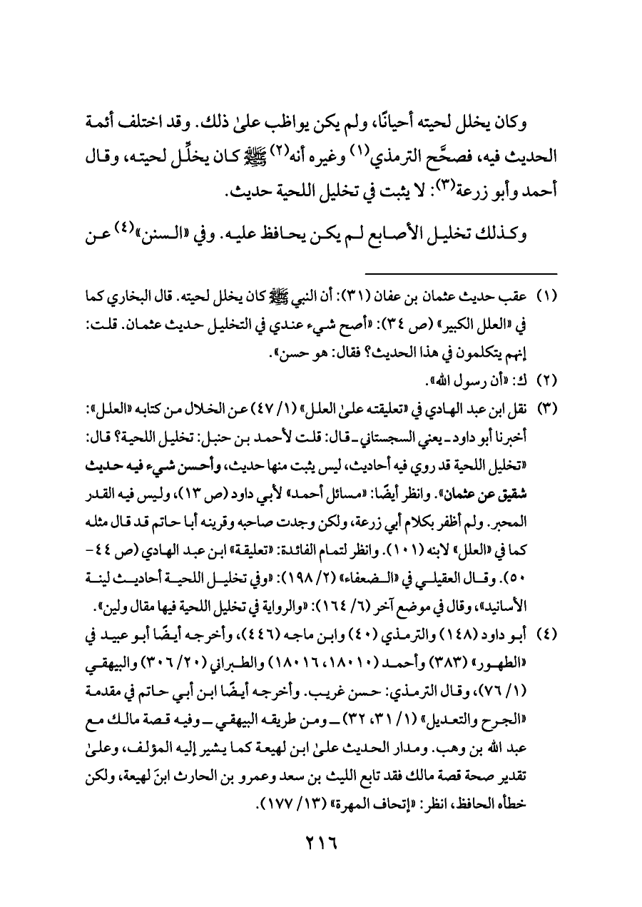 (¬١) عقب حديث عثمان بن عفان (٣١): أن النبي - صلى الله عليه وسلم - كان يخلل لحيته. قال البخاري كما في «العلل الكبير» (ص ٣٤): «أصح شيء عندي في التخليل حديث عثمان. قلت: إنهم يتكلمون في هذا الحديث؟ فقال: هو حسن».
