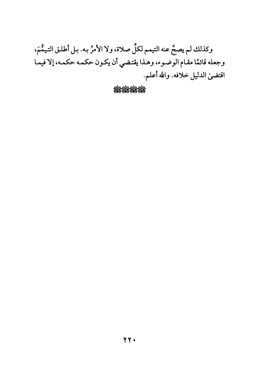 وكذلك لم يصحَّ عنه التيمم لكلِّ صلاة، ولا الأمرُ به. بل أطلق التيمُّمَ، وجعله قائمًا مقام الوضوء، وهذا يقتضي أن يكون حكمه حكمه، إلا فيما اقتضى الدليل خلافه. والله أعلم.