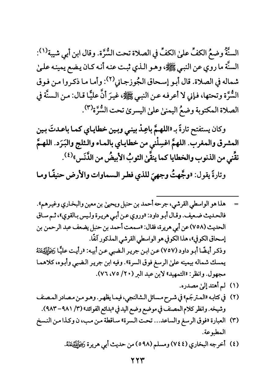 السنَّةُ وضعُ الكفِّ على الكفِّ في الصلاة تحت السُّرَّة. وقال ابن أبي شيبة (¬١): السنَّة ما روي عن النبي - صلى الله عليه وسلم -، وهو الذي ثبت عنه أنه كان يضع يمينه على شماله في الصلاة. قال أبو إسحاق الجُوزجاني (¬٢): وأما ما ذكروا من فوق السُّرَّة وتحتها، فإني لا أعرفه عن النبي - صلى الله عليه وسلم -، غيرَ أنَّ عليًّا قال: من السنَّة في الصلاة المكتوبة وضعُ اليمنى على اليسرى تحت السُّرَّة (¬٣).