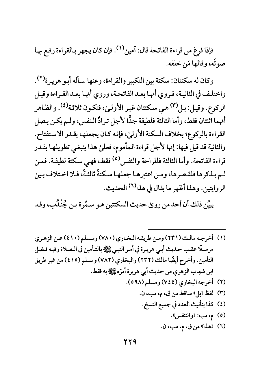 وكان له سكتتان: سكتة بين التكبير والقراءة، وعنها سأله أبو هريرة (¬٢). واختلف في الثانية، فروي أنها بعد الفاتحة، وروي أنها بعد القراءة وقبل الركوع. وقيل: بل (¬٣) هي سكتتان غير الأولى، فتكون ثلاثة (¬٤). والظاهر أنهما اثنتان فقط، وأما الثالثة فلطيفة جدًّا لأجل ترادِّ النفس، ولم يكن يصل القراءة بالركوع؛ بخلاف السكتة الأولى، فإنه كان يجعلها بقدر الاستفتاح. والثانية قد قيل فيها: إنها لأجل قراءة المأموم، فعلى هذا ينبغي تطويلها بقدر قراءة الفاتحة. وأما الثالثة فللراحة والنفس (¬٥) فقط، فهي سكتة لطيفة. فمن لم يذكرها فلقصرها، ومن اعتبرها جعلها سكتةً ثالثةً، فلا اختلاف بين الروايتين. وهذا أظهر ما يقال في هذا (¬٦) الحديث.