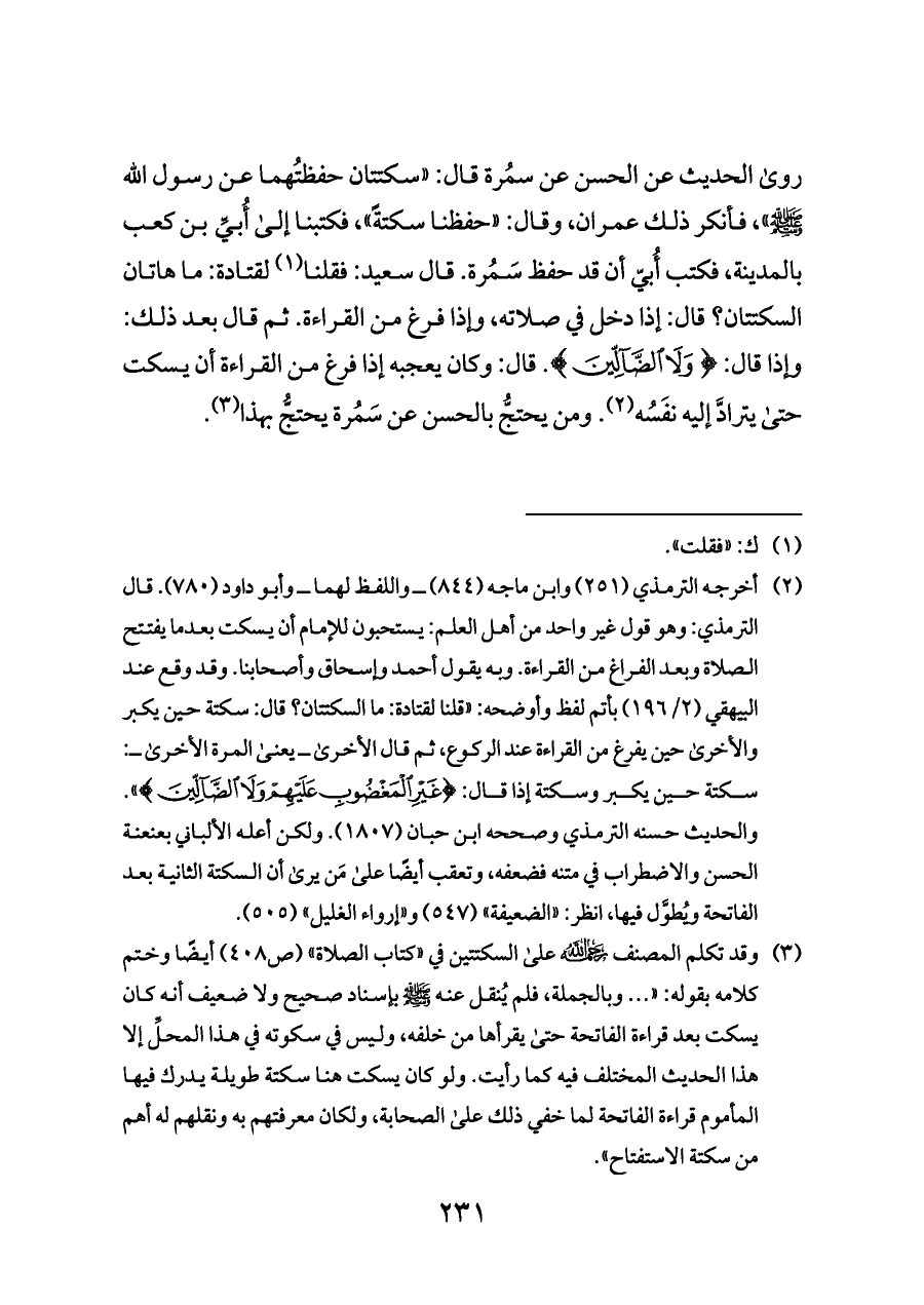 (¬٣) وقد تكلم المصنف - رحمه الله - على السكتتين في «كتاب الصلاة» (ص ٤٠٨) أيضًا وختم كلامه بقوله: « ... وبالجملة، فلم يُنقل عنه - صلى الله عليه وسلم - بإسناد صحيح ولا ضعيف أنه كان يسكت بعد قراءة الفاتحة حتى يقرأها من خلفه، وليس في سكوته في هذا المحلِّ إلا هذا الحديث المختلف فيه كما رأيت. ولو كان يسكت هنا سكتة طويلة يدرك فيها المأموم قراءة الفاتحة لما خفي ذلك على الصحابة، ولكان معرفتهم به ونقلهم له أهم من سكتة الاستفتاح».