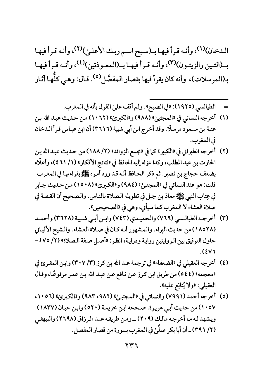 الدخان) (¬١)، وأنه قرأ فيها بـ (سبح اسم ربك الأعلى) (¬٢)، وأنه قرأ فيها بـ (التين والزيتون) (¬٣)، وأنه قرأ فيها بـ (المعوذتين) (¬٤)، وأنه قرأ فيها بـ (المرسلات)، وأنه كان يقرأ فيها بقصار المفصَّل (¬٥). قال: وهي كلُّها آثار