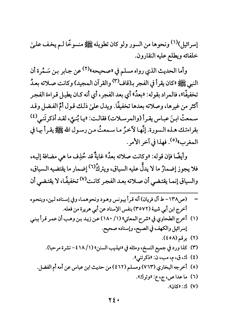 وأما الحديث الذي رواه مسلم في «صحيحه» (¬٢) عن جابر بن سَمُرة أن النبي - صلى الله عليه وسلم - «كان يقرأ في الفجر بـ (قاف (¬٣) والقرآن المجيد) وكانت صلاته بعدُ تخفيفًا»، فالمراد بقوله: «بعدُ» أي بعد الفجر، أي أنه كان يطيل قراءة الفجر أكثر من غيرها، وصلاته بعدها تخفيفًا. ويدل على ذلك قول أمِّ الفضل وقد سمعتْ ابنَ عباس يقرأ (والمرسلات) فقالت: «يا بُنيَّ، لقد أذكرتَني (¬٤) بقراءتك هذه السورة. إنَّها لآخرُ ما سمعتُ من رسول الله - صلى الله عليه وسلم - يقرأ بها في المغرب» (¬٥). فهذا في آخر الأمر.