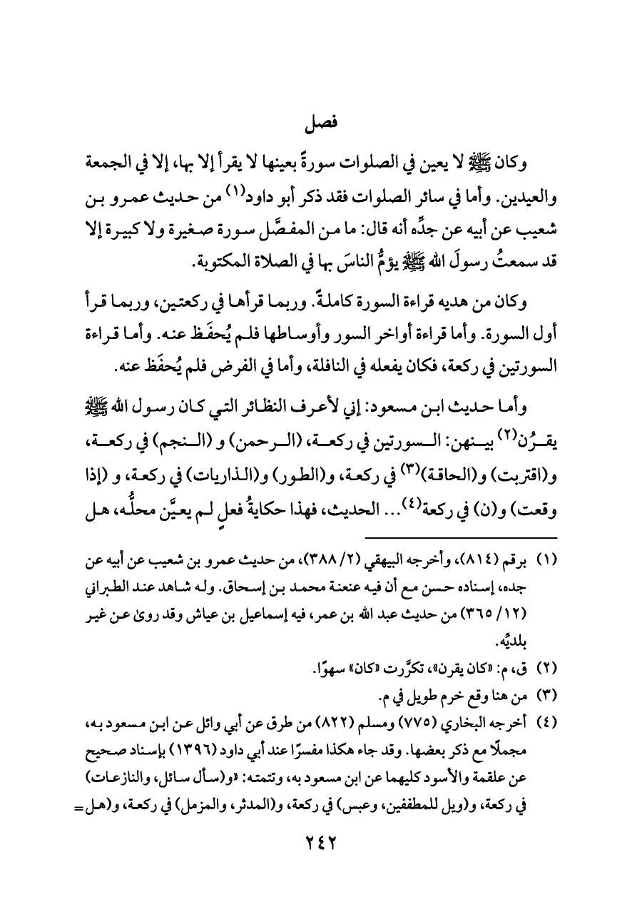 وكان - صلى الله عليه وسلم - لا يعين في الصلوات سورةً بعينها لا يقرأ إلا بها، إلا في الجمعة والعيدين. وأما في سائر الصلوات فقد ذكر أبو داود (¬١) من حديث عمرو بن شعيب عن أبيه عن جدِّه أنه قال: ما من المفصَّل سورة صغيرة ولا كبيرة إلا قد سمعتُ رسولَ الله - صلى الله عليه وسلم - يؤمُّ الناسَ بها في الصلاة المكتوبة.