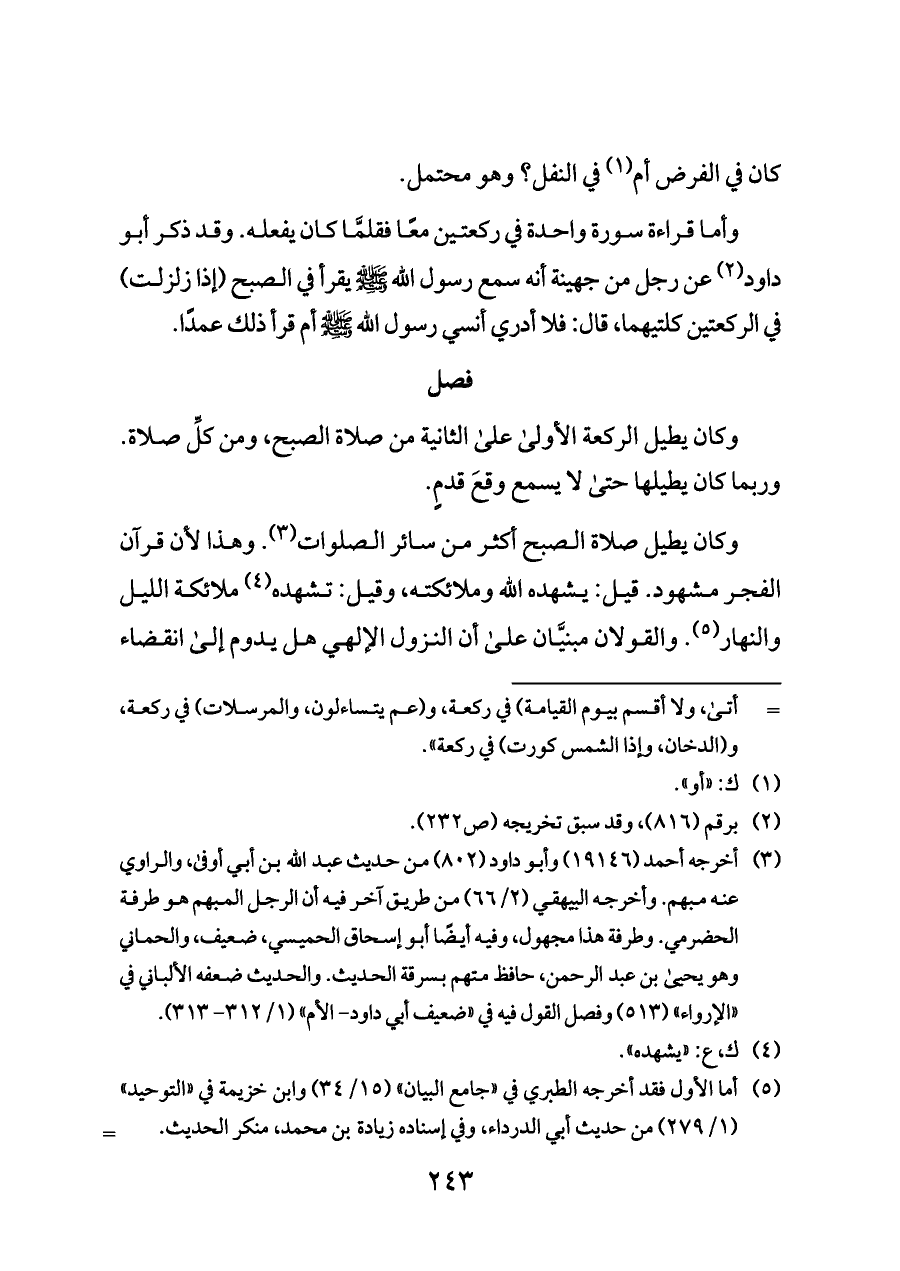 وكان يطيل صلاة الصبح أكثر من سائر الصلوات (¬٣). وهذا لأن قرآن الفجر مشهود. قيل: يشهده الله وملائكته، وقيل: تشهده (¬٤) ملائكة الليل والنهار (¬٥). والقولان مبنيَّان على أن النزول الإلهي هل يدوم إلى انقضاء