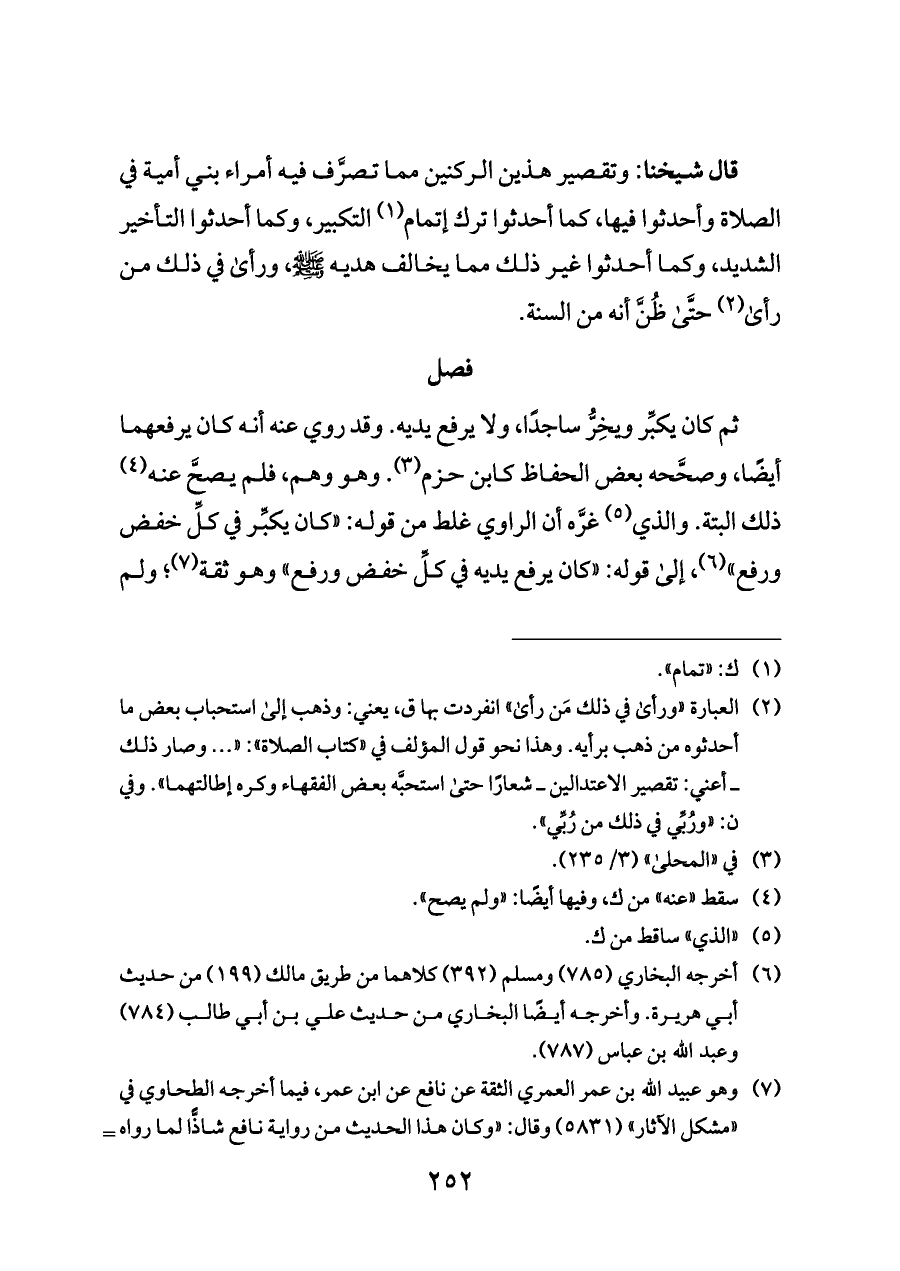 (¬٧) وهو عبيد الله بن عمر العمري الثقة عن نافع عن ابن عمر، فيما أخرجه الطحاوي في «مشكل الآثار» (٥٨٣١) وقال: «وكان هذا الحديث من رواية نافع شاذًّا لما رواه عبيد الله، وقد روي هذا الحديث عن نافع بخلاف ما رواه عنه عبيد الله». انظر التخريج السابق. وقد ورد مصرَّحًا في حديث ابن عمر أنه لم يفعل ذلك في السجود، أخرجه مالك (١٩٦) والبخاري (٧٣٥، ٧٣٦، ٧٣٨، ٧٣٩) ومسلم (٣٩٠).