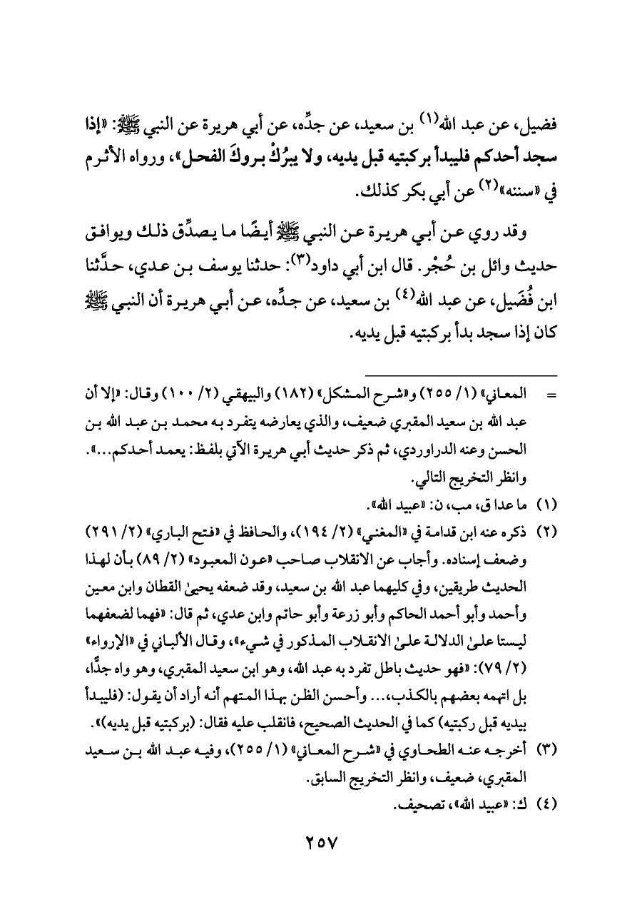 (¬٢) ذكره عنه ابن قدامة في «المغني» (٢/ ١٩٤)، والحافظ في «فتح الباري» (٢/ ٢٩١) وضعف إسناده. وأجاب عن الانقلاب صاحب «عون المعبود» (٢/ ٨٩) بأن لهذا الحديث طريقين، وفي كليهما عبد الله بن سعيد، وقد ضعفه يحيى القطان وابن معين وأحمد وأبو أحمد الحاكم وأبو زرعة وأبو حاتم وابن عدي، ثم قال: «فهما لضعفهما ليستا على الدلالة على الانقلاب المذكور في شيء»، وقال الألباني في «الإرواء» (٢/ ٧٩): «فهو حديث باطل تفرد به عبد الله، وهو ابن سعيد المقبري، وهو واه جدًّا، بل اتهمه بعضهم بالكذب، ... وأحسن الظن بهذا المتهم أنه أراد أن يقول: (فليبدأ بيديه قبل ركبتيه) كما في الحديث الصحيح، فانقلب عليه فقال: (بركبتيه قبل يديه)».