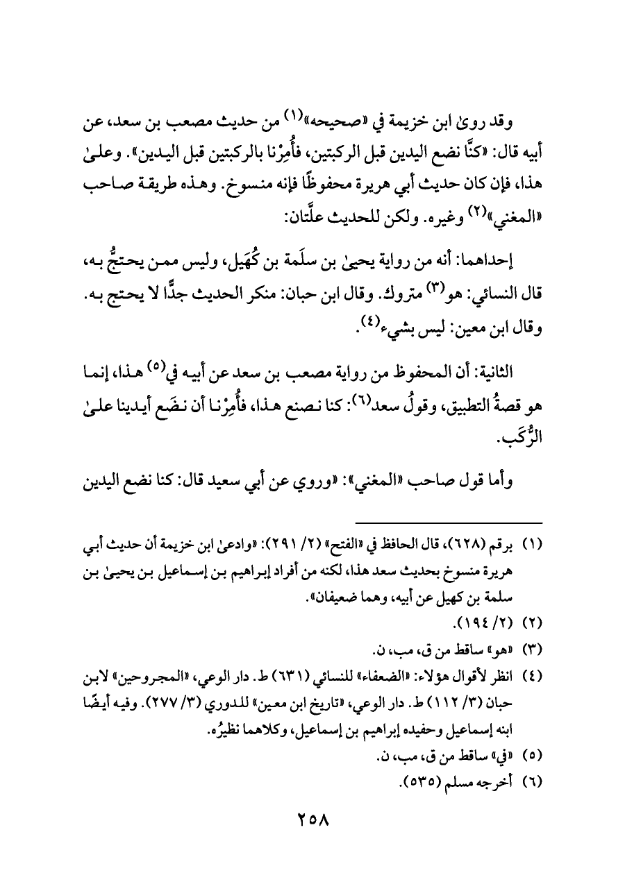 (¬١) برقم (٦٢٨)، قال الحافظ في «الفتح» (٢/ ٢٩١): «وادعى ابن خزيمة أن حديث أبي هريرة منسوخ بحديث سعد هذا، لكنه من أفراد إبراهيم بن إسماعيل بن يحيى بن سلمة بن كهيل عن أبيه، وهما ضعيفان».