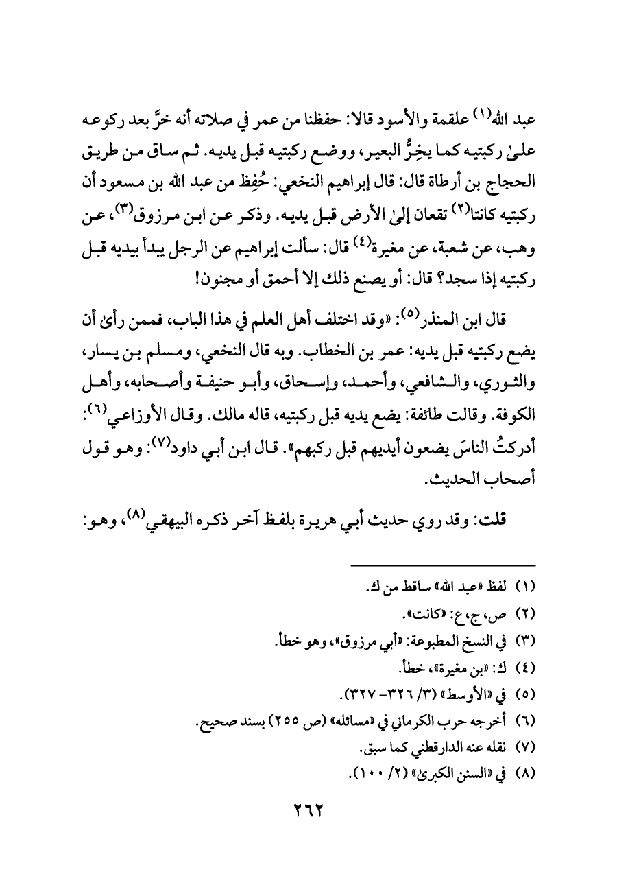 عبد الله (¬١) علقمة والأسود قالا: حفظنا من عمر في صلاته أنه خرَّ بعد ركوعه على ركبتيه كما يخِرُّ البعير، ووضع ركبتيه قبل يديه. ثم ساق من طريق الحجاج بن أرطاة قال: قال إبراهيم النخعي: حُفِظ من عبد الله بن مسعود أن ركبتيه كانتا (¬٢) تقعان إلى الأرض قبل يديه. وذكر عن ابن مرزوق (¬٣)، عن وهب، عن شعبة، عن مغيرة (¬٤) قال: سألت إبراهيم عن الرجل يبدأ بيديه قبل ركبتيه إذا سجد؟ قال: أو يصنع ذلك إلا أحمق أو مجنون!
