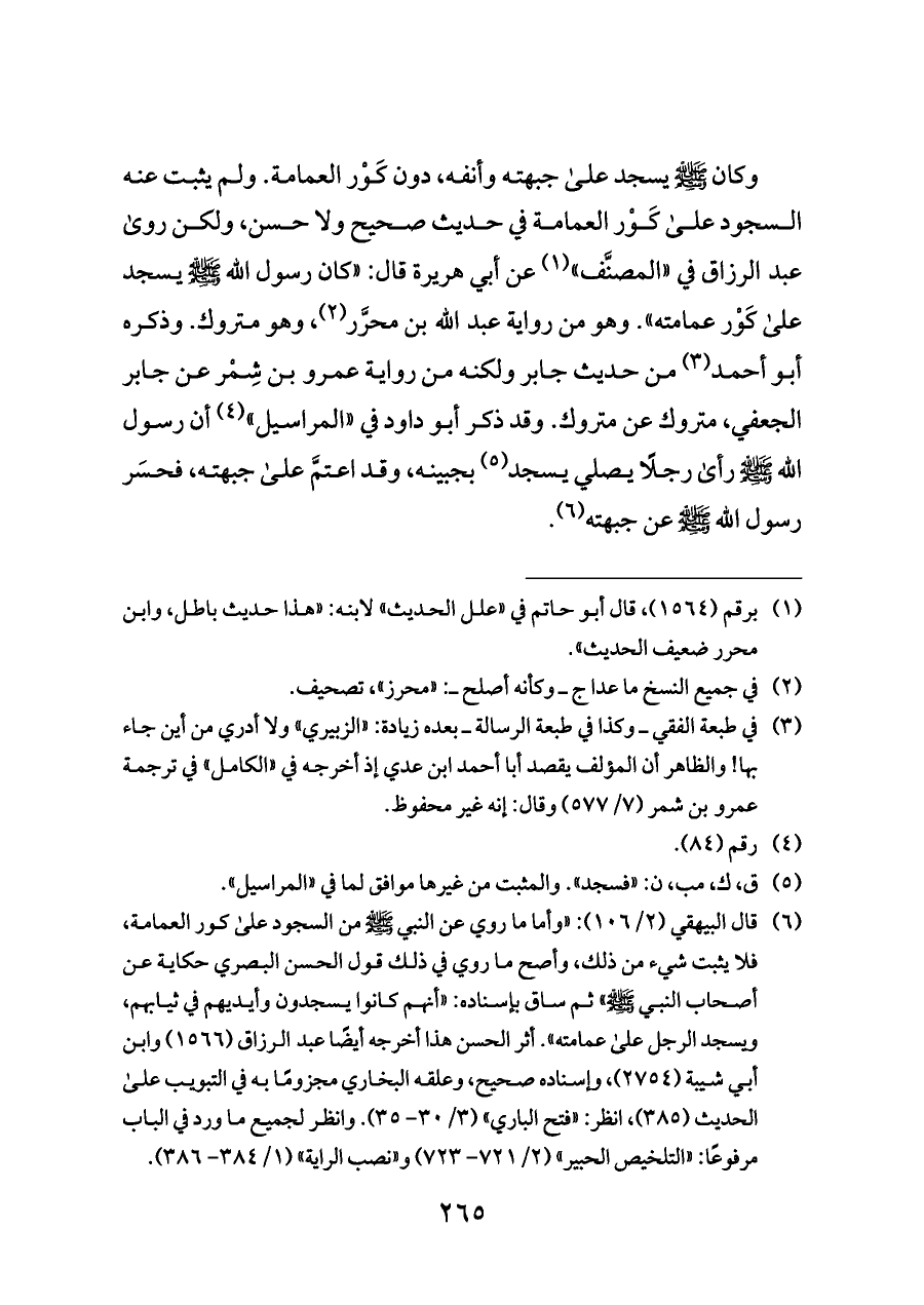 (¬٦) قال البيهقي (٢/ ١٠٦): «وأما ما روي عن النبي - صلى الله عليه وسلم - من السجود على كور العمامة، فلا يثبت شيء من ذلك، وأصح ما روي في ذلك قول الحسن البصري حكاية عن أصحاب النبي - صلى الله عليه وسلم -» ثم ساق بإسناده: «أنهم كانوا يسجدون وأيديهم في ثيابهم، ويسجد الرجل على عمامته». أثر الحسن هذا أخرجه أيضًا عبد الرزاق (١٥٦٦) وابن أبي شيبة (٢٧٥٤)، وإسناده صحيح، وعلقه البخاري مجزومًا به في التبويب على الحديث (٣٨٥)، انظر: «فتح الباري» (٣/ ٣٠ - ٣٥). وانظر لجميع ما ورد في الباب مرفوعًا: «التلخيص الحبير» (٢/ ٧٢١ - ٧٢٣) و «نصب الراية» (١/ ٣٨٤ - ٣٨٦).