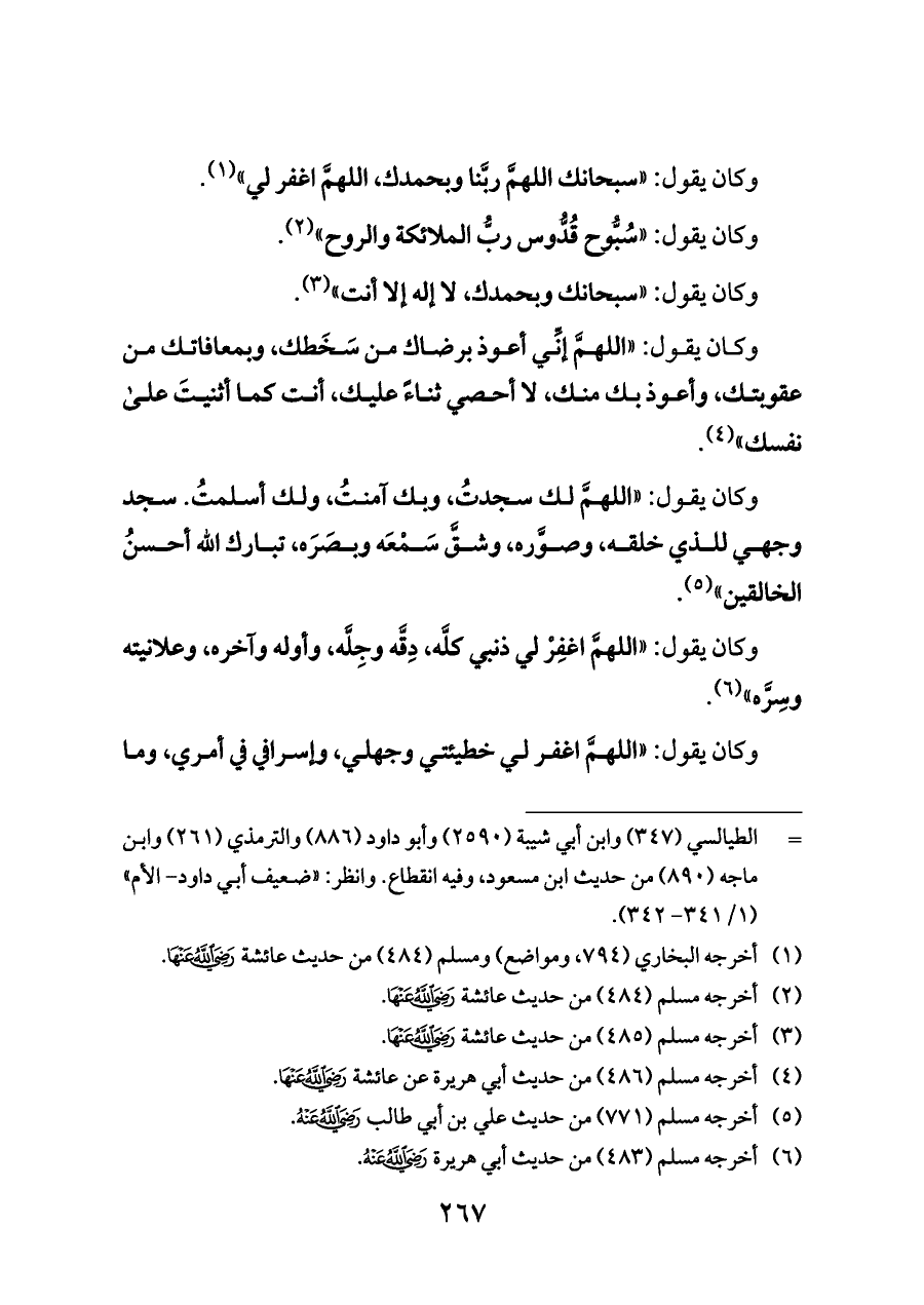 وكان يقول: «اللهمَّ لك سجدتُ، وبك آمنتُ، ولك أسلمتُ. سجد وجهي للذي خلقه, وصوَّره, وشقَّ سَمْعَه وبصَرَه، تبارك الله أحسنُ الخالقين» (¬٥).