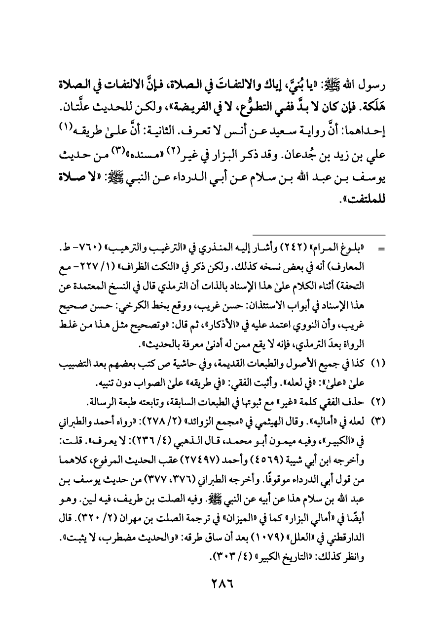رسول الله - صلى الله عليه وسلم -: «يا بُنيَّ، إياك والالتفاتَ في الصلاة، فإنَّ الالتفات في الصلاة هَلَكة. فإن كان لا بدَّ ففي التطوُّع، لا في الفريضة»، ولكن للحديث علَّتان. إحداهما: أنَّ رواية سعيد عن أنس لا تعرف. الثانية: أنَّ على طريقه (¬١) علي بن زيد بن جُدعان. وقد ذكر البزار في غير (¬٢) «مسنده» (¬٣)