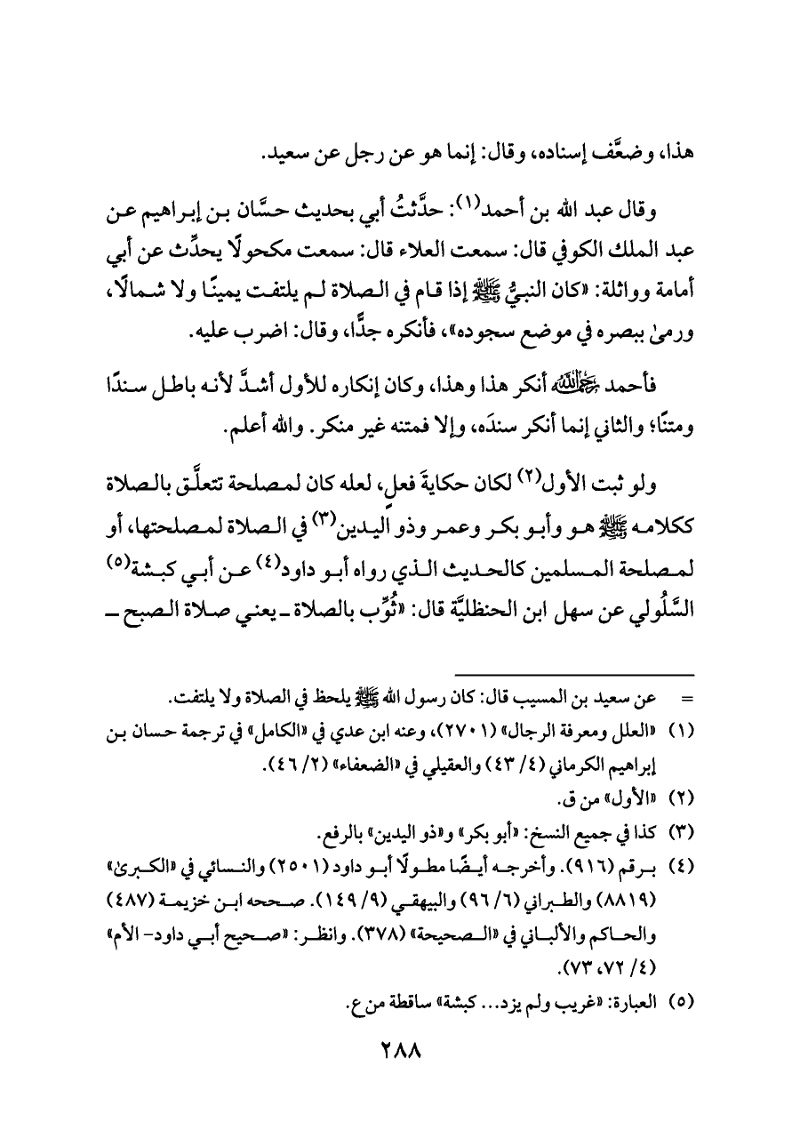 وقال عبد الله بن أحمد (¬١): حدَّثتُ أبي بحديث حسَّان بن إبراهيم عن عبد الملك الكوفي قال: سمعت العلاء قال: سمعت مكحولًا يحدِّث عن أبي أمامة وواثلة: «كان النبيُّ - صلى الله عليه وسلم - إذا قام في الصلاة لم يلتفت يمينًا ولا شمالًا، ورمى ببصره في موضع سجوده»، فأنكره جدًّا، وقال: اضرب عليه.