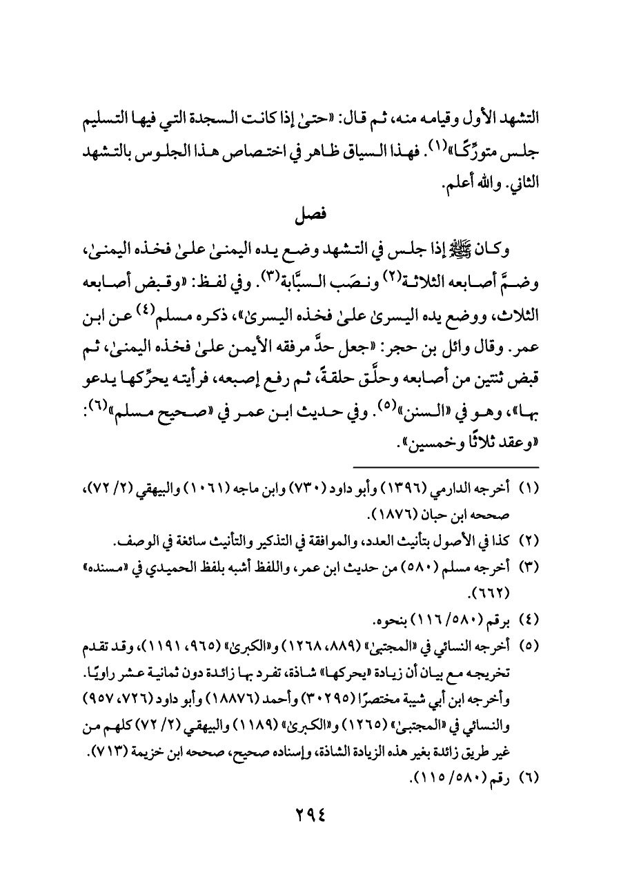وكان - صلى الله عليه وسلم - إذا جلس في التشهد وضع يده اليمنى على فخذه اليمنى، وضمَّ أصابعه الثلاثة (¬٢) ونصَب السبَّابة (¬٣). وفي لفظ: «وقبض أصابعه الثلاث، ووضع يده اليسرى على فخذه اليسرى»، ذكره مسلم (¬٤) عن ابن عمر. وقال وائل بن حجر: «جعل حدَّ مرفقه الأيمن على فخذه اليمنى، ثم قبض ثنتين من أصابعه وحلَّق حلقةً، ثم رفع إصبعه، فرأيته يحرِّكها يدعو بها»، وهو في «السنن» (¬٥). وفي حديث ابن عمر في «صحيح مسلم» (¬٦): «وعقد ثلاثًا وخمسين».