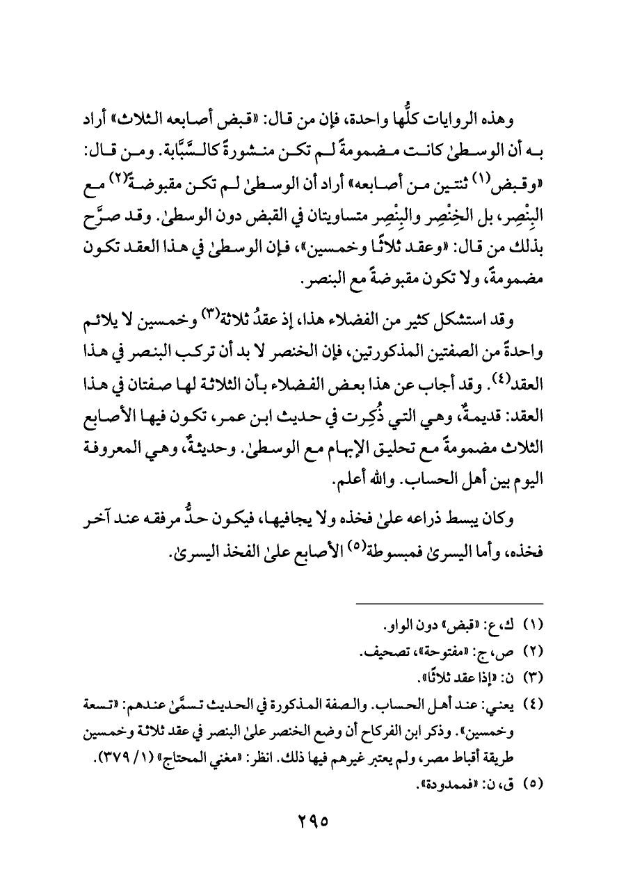 وقد استشكل كثير من الفضلاء هذا، إذ عقدُ ثلاثة (¬٣) وخمسين لا يلائم واحدةً من الصفتين المذكورتين، فإن الخنصر لا بد أن تركب البنصر في هذا العقد (¬٤). وقد أجاب عن هذا بعض الفضلاء بأن الثلاثة لها صفتان في هذا العقد: قديمةٌ، وهي التي ذُكِرت في حديث ابن عمر، تكون فيها الأصابع الثلاث مضمومةً مع تحليق الإبهام مع الوسطى. وحديثةٌ، وهي المعروفة اليوم بين أهل الحساب. والله أعلم.