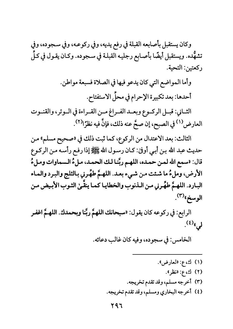 الثالث: بعد الاعتدال من الركوع, كما ثبت ذلك في «صحيح مسلم» من حديث عبد الله بن أبي أوفى: كان رسول الله - صلى الله عليه وسلم - إذا رفع رأسه من الركوع قال: «سمع الله لمن حمده، اللهم ربَّنا لك الحمد، ملءُ السماوات وملءُ الأرض، وملءُ ما شئت من شيء بعد. اللهمَّ طهِّرني بالثلج والبرد والماء البارد. اللهمَّ طهِّرني من الذنوب والخطايا كما ينقَّى الثوب الأبيض من الوسخ» (¬٣).