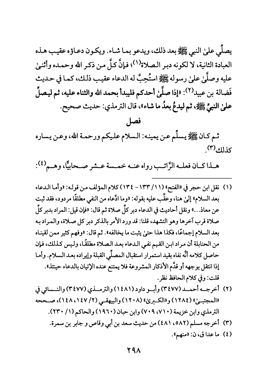 (¬١) نقل ابن حجر في «الفتح» (١١/ ١٣٣ - ١٣٤) كلام المؤلف من قوله: «وأما الدعاء بعد السلام» إلى هنا، وعقَّب عليه بقوله: «وما ادَّعاه من النفي مطلقًا مردود، فقد ثبت عن معاذ ... » ونقل أحاديث في الدعاء دبر كلِّ صلاة ثم قال: «فإن قيل: المراد بدبر كلِّ صلاة قرب آخرها وهو التشهد، قلنا: قد ورد الأمر بالذكر دبر كل صلاة، والمراد به بعد السلام إجماعًا، فكذا هذا حتى يثبت ما يخالفه». ثم قال: «وفهم كثير ممن لقيناه من الحنابلة أن مراد ابن القيم نفي الدعاء بعد الصلاة مطلقًا، وليس كذلك، فإن حاصل كلامه أنَّه نفاه بقيد استمرار استقبال المصلِّي القبلة وإيراده بعد السلام. وأما إذا انتقل بوجهه أو قدَّم الأذكار المشروعة فلا يمتنع عنده الإتيان بالدعاء حينئذ».