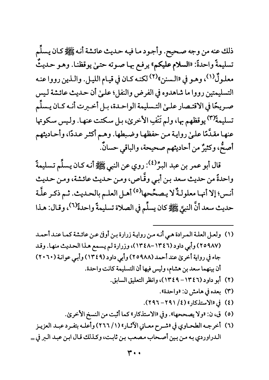 (¬١) ولعل العلة المرادة هي أنه من رواية زرارة بن أوفى عن عائشة كما عند أحمد (٢٥٩٨٧) وأبي داود (١٣٤٦ - ١٣٤٨)، وزرارة لم يسمع هذا الحديث منها. وقد جاء في رواية أخرى عند أحمد (٢٥٩٨٨) وأبي داود (١٣٤٩) وأبي عوانة (٢٠٦٠) أن بينهما سعد بن هشام، وليس فيها أن التسليمة كانت واحدة.