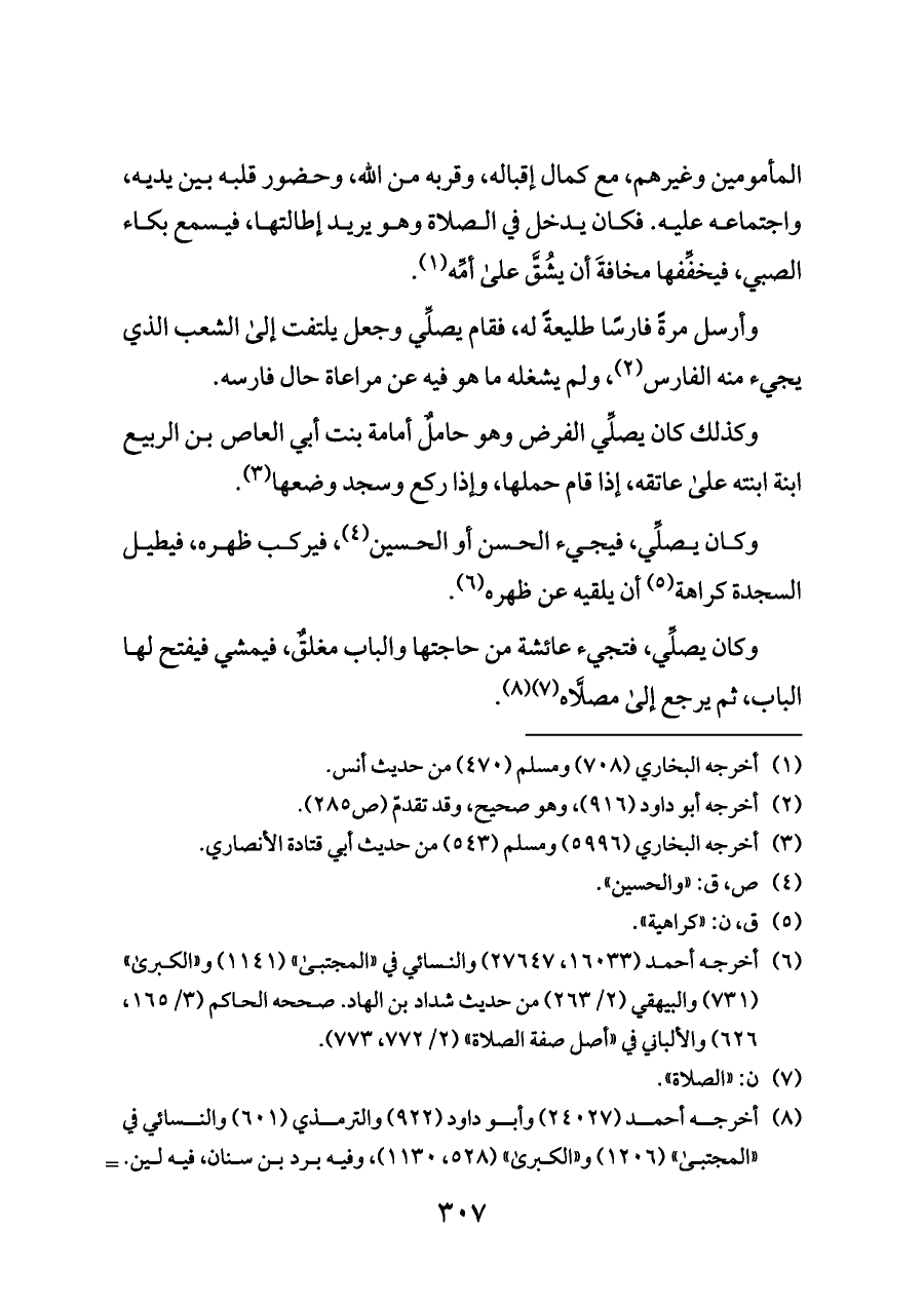 المأمومين وغيرهم، مع كمال إقباله، وقربه من الله، وحضور قلبه بين يديه، واجتماعه عليه. فكان يدخل في الصلاة وهو يريد إطالتها، فيسمع بكاء الصبي، فيخفِّفها مخافةَ أن يشُقَّ على أمِّه (¬١).