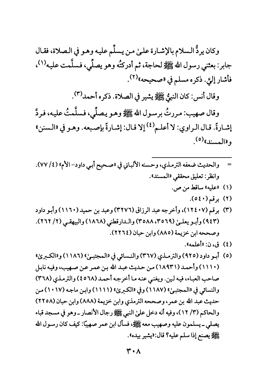 (¬٥) أبو داود (٩٢٥) والترمذي (٣٦٧) والنسائي في «المجتبى» (١١٨٦) و «الكبرى» (١١١٠) وأحمد (١٨٩٣١) من حديث عبد الله بن عمر عن صهيب، وفيه نابل صاحب العباء، فيه لين. ويغني عنه ما أخرجه أحمد (٤٥٦٨) والترمذي (٣٦٨) والنسائي في «المجتبى» (١١٨٧) وفي «الكبرى» (١١١١) وابن ماجه (١٠١٧) من حديث عبد الله بن عمر، وصححه الترمذي وابن خزيمة (٨٨٨) وابن حبان (٢٢٥٨) والحاكم (٣/ ١٢)، وفيه أنه دخل على النبي - صلى الله عليه وسلم - رجال الأنصار ــ وهو في مسجد قباء يصلي ــ يسلمون عليه وصهيب معه - صلى الله عليه وسلم -، فسأل ابن عمر صهيبًا: كيف كان رسول الله - صلى الله عليه وسلم - يصنع إذا سلم عليه؟ قال: «يشير بيده».