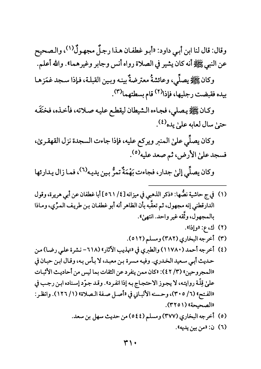 وقال: قال لنا ابن أبي داود: «أبو غطفان هذا رجلٌ مجهولٌ (¬١)، والصحيح عن النبي - صلى الله عليه وسلم - أنه كان يشير في الصلاة رواه أنس وجابر وغيرهما». والله أعلم.