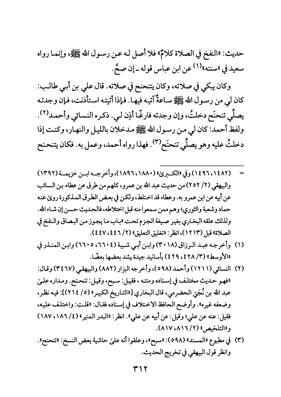 (¬٢) النسائي (١٢١١) وأحمد (٥٩٨)، وأخرجه البزار (٨٨٢) والبيهقي (٣٤٦٧) وقال: «فهو حديث مختلف في إسناده ومتنه، فقيل: سبح، وقيل: تنحنح. ومداره على عبد الله بن نُجَيّ الحضرمي، قال البخاري [«التاريخ الكبير» (٥/ ٢١٤)]: فيه نظر، وضعفه غيره». وأوضح الحافظ الاختلاف في إسناده فقال: «قلت: واختلف عليه، فقيل: عنه عن علي؛ وقيل: عن أبيه عن علي». انظر: «البدر المنير» (٤/ ١٨٦، ١٨٧) و «التلخيص» (٢/ ٨١٦، ٨١٧).