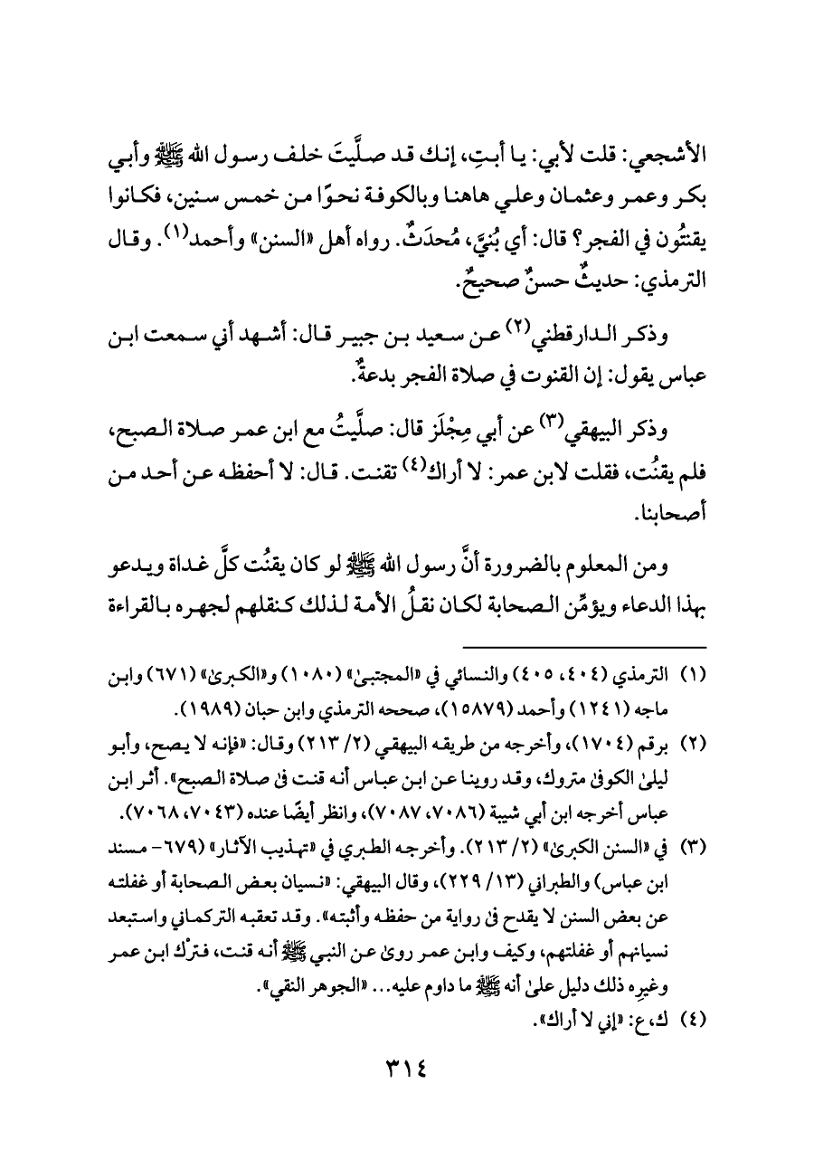 الأشجعي: قلت لأبي: يا أبتِ، إنك قد صلَّيتَ خلف رسول الله - صلى الله عليه وسلم - وأبي بكر وعمر وعثمان وعلي هاهنا وبالكوفة نحوًا من خمس سنين، فكانوا يقنتُون في الفجر؟ قال: أي بُنيَّ، مُحدَثٌ. رواه أهل «السنن» وأحمد (¬١). وقال الترمذي: حديثٌ حسنٌ صحيحٌ.