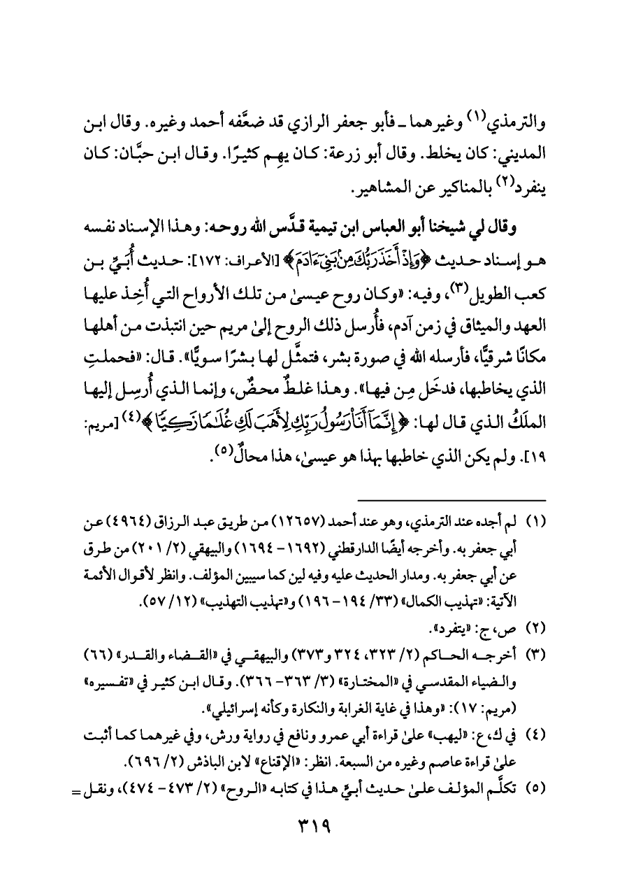 وقال لي شيخنا أبو العباس ابن تيمية قدَّس الله روحه: وهذا الإسناد نفسه هو إسناد حديث {وَإِذْ أَخَذَ رَبُّكَ مِنْ بَنِي آدَمَ} [الأعراف: ١٧٢]: حديث أُبَيِّ بن كعب الطويل (¬٣)، وفيه: «وكان روح عيسى من تلك الأرواح التي أُخِذ عليها العهد والميثاق في زمن آدم، فأُرسل ذلك الروح إلى مريم حين انتبذت من أهلها مكانًا شرقيًّا، فأرسله الله في صورة بشر، فتمثَّل لها بشرًا سويًّا». قال: «فحملتِ الذي يخاطبها، فدخَل مِن فيها». وهذا غلطٌ محضٌ، وإنما الذي أُرسِل إليها الملَكُ الذي قال لها: {إِنَّمَا أَنَا رَسُولُ رَبِّكِ لِأَهَبَ لَكِ غُلَامًا زَكِيًّا} (¬٤) [مريم: ١٩]. ولم يكن الذي خاطبها بهذا هو عيسى، هذا محالٌ (¬٥).
