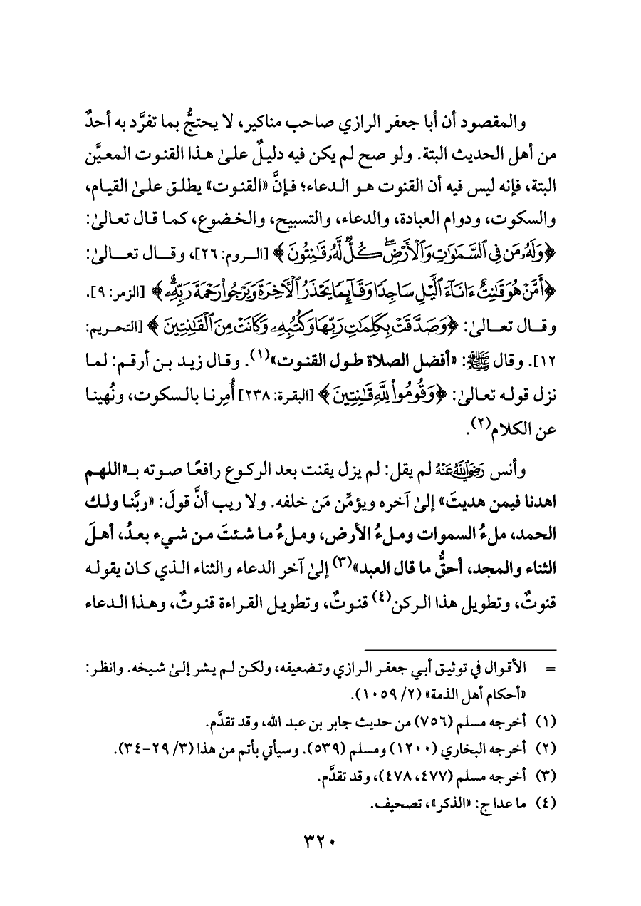 والمقصود أن أبا جعفر الرازي صاحب مناكير، لا يحتجُّ بما تفرَّد به أحدٌ من أهل الحديث البتة. ولو صح لم يكن فيه دليلٌ على هذا القنوت المعيَّن البتة، فإنه ليس فيه أن القنوت هو الدعاء؛ فإنَّ «القنوت» يطلق على القيام، والسكوت، ودوام العبادة، والدعاء، والتسبيح، والخضوع، كما قال تعالى: {وَلَهُ مَنْ فِي السَّمَاوَاتِ وَالْأَرْضِ كُلٌّ لَهُ قَانِتُونَ} [الروم: ٢٦]، وقال تعالى: {(٨) أَمَّنْ هُوَ قَانِتٌ آنَاءَ اللَّيْلِ سَاجِدًا وَقَائِمًا يَحْذَرُ الْآخِرَةَ وَيَرْجُو رَحْمَةَ رَبِّهِ} [الزمر: ٩]. وقال تعالى: {وَصَدَّقَتْ بِكَلِمَاتِ رَبِّهَا وَكُتُبِهِ وَكَانَتْ مِنَ الْقَانِتِينَ} [التحريم: ١٢]. وقال - صلى الله عليه وسلم -: «أفضل الصلاة طول القنوت» (¬١). وقال زيد بن أرقم: لما نزل قوله تعالى: {وَقُومُوا لِلَّهِ قَانِتِينَ} [البقرة: ٢٣٨] أُمِرنا بالسكوت، ونُهينا عن الكلام (¬٢).