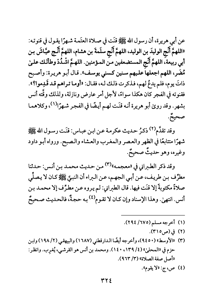 عن أبي هريرة، أن رسول الله - صلى الله عليه وسلم - قنَت في صلاة العتَمة شهرًا يقول في قنوته: «اللهمَّ أَنْجِ الوليدَ بن الوليد، اللهمَّ أَنْجِ سلَمةَ بن هشام، اللهمَّ أَنْج عيَّاشَ بن أبي ربيعة، اللهمَّ أَنْجِ المستضعفين من المؤمنين. اللهمَّ اشْدُدْ وطأتَك على مُضَر، اللهم اجعلها عليهم سنين كسني يوسف». قال أبو هريرة: وأصبح ذاتَ يوم، فلم يدعُ لهم، فذكرت ذلك له، فقال: «أوما تراهم قد قَدِموا؟». فقنوته في الفجر كان هكذا سواءً، لأجل أمر عارض ونازلة، ولذلك وقَّته أنس بشهر. وقد روى أبو هريرة أنه قنَت لهم أيضًا في الفجر شهرًا (¬١)، وكلاهما صحيحٌ.
